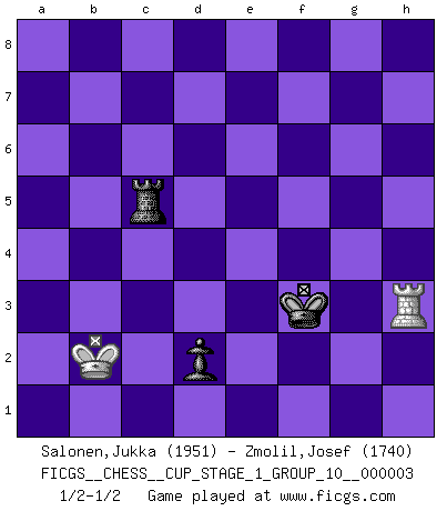 Last move : 1/2-1/2 2020 May 13 15:55:52 [Event "FICGS__CHESS__CUP_STAGE_1_GROUP_10__000003"] [Site "FICGS"] [Date "2019.11.02"] [Round "1"] [White "Salonen,Jukka"] [Black "Zmolil,Josef"] [Result "1/2-1/2"] [WhiteElo "1951"] [BlackElo "1740"] 1.e4 c6 2.d4 d5 3.e5 Bf5 4.Nf3 e6 5.Be2 c5 6.Be3 cxd4 7.Nxd4 Ne7 8.Nd2 Nbc6 9.N2f3 Be4 10.O-O Bxf3 11.Nxf3 Nf5 12.Bf4 Be7 13.Bd3 g5 14.Bxf5 exf5 15.Be3 f4 16.Bd4 O-O 17.h3 Qd7 18.Bc3 b5 19.Qd3 b4 20.Bd2 a5 21.c3 Qe6 22.Rfe1 Rfc8 23.Rad1 Kg7 24.Rc1 h6 25.Nd4 Nxd4 26.cxd4 Rab8 27.Red1 Rc4 28.b3 Rxc1 29.Rxc1 Bd8 30.f3 Bb6 31.Kh2 Re8 32.Be1 h5 33.Bf2 g4 34.fxg4 hxg4 35.hxg4 Qxg4 36.Qf3 Rh8+ 37.Kg1 Qf5 38.Rf1 Qh5 39.Qxh5 Rxh5 40.Rc1 Rh6 41.Rc8 Re6 42.Rb8 Kg6 43.Rb7 f6 44.Rd7 fxe5 45.dxe5 Bxf2+ 46.Kxf2 Rxe5 47.Kf3 Kf5 48.Rf7+ Ke6 49.Ra7 Re4 50.Rxa5 Ke5 51.Rb5 Re3+ 52.Kf2 Ke4 53.Rxb4+ d4 54.Rc4 f3 55.gxf3+ Rxf3+ 56.Ke1 Rh3 57.Rc8 Rh1+ 58.Kd2 Rh2+ 59.Kc1 Rxa2 60.b4 Rg2 61.Re8+ Kd3 62.b5 Rc2+ 63.Kd1 Rb2 64.Kc1 Rxb5 65.Ra8 Rh5 66.Ra3+ Ke2 67.Rg3 Rc5+ 68.Kb2 d3 69.Rg2+ Kd1 70.Rg1+ Kd2 71.Rg2+ Ke1 72.Rh2 d2 73.Rh1+ Ke2 74.Rh2+ Kd3 75.Rh3+ Ke4 76.Rh4+ Kf3 77.Rh3+ 1/2-1/2 Caro-Kann : Advance variation Kingside Castling by player White (move 10) Kingside Castling by player Black (move 16) 10 pieces endgame at move 50 : White KRPPP , Black KRPPP WHITE : King + 1 Rook 3 Pawns BLACK : King + 1 Rook 3 Pawns 9 pieces endgame at move 53 : White KRPPP , Black KRPP WHITE : King + 1 Rook 3 Pawns BLACK : King + 1 Rook 2 Pawns 8 pieces endgame at move 55 : White KRPPP , Black KRP WHITE : King + 1 Rook 3 Pawns BLACK : King + 1 Rook 1 Pawn 7 pieces endgame at move 55 : White KRPP , Black KRP WHITE : King + 1 Rook 2 Pawns BLACK : King + 1 Rook 1 Pawn 6 pieces endgame at move 59 : White KRP , Black KRP WHITE : King + 1 Rook 1 Pawn BLACK : King + 1 Rook 1 Pawn 5 pieces endgame at move 64 : White KR , Black KRP WHITE : King + 1 Rook BLACK : King + 1 Rook 1 Pawn This chess game ended in a draw. Follow this game move after move (download)Chess problems demand from the composer the same virtues that characterize all worthwhile art: originality, invention, conciseness, harmony, complexity, and splendid insincerity. (Vladimir Nabokov) Wenn Du nicht kämpfst, um anderen etwas zu beweisen, sondern nur für Dich selbst, dann bist du fast unbesiegbar. (Garry Kasparov) Si un gobernante no entiende al Ajedrez, ¿como puede governar él un reinado?. (El Rey Khusros II) Même un GMI sait rarement calculer sur plus de cinq coups une attaque à sacrifices. (Rudolf Spielmann) You lose, general Kenobi. (General Grievous in Star Wars ep.3)