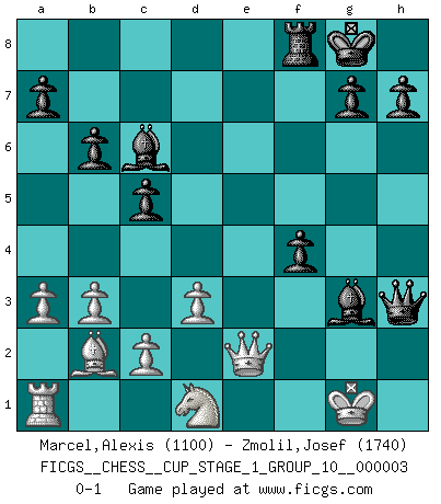 Last move : 0-1 2020 January 6 6:35:9 [Event "FICGS__CHESS__CUP_STAGE_1_GROUP_10__000003"] [Site "FICGS"] [Date "2019.11.02"] [Round "1"] [White "Marcel,Alexis"] [Black "Zmolil,Josef"] [Result "0-1"] [WhiteElo "1100"] [BlackElo "1740"] 1.f4 d5 2.Nf3 Nf6 3.e3 c5 4.b3 e6 5.Bb2 Be7 6.Be2 O-O 7.O-O b6 8.Nc3 Bb7 9.a3 Nc6 10.h3 d4 11.exd4 Nh5 12.Ne5 Qxd4+ 13.Kh2 Nxf4 14.Nxc6 Bxc6 15.g3 Nxe2 16.Qxe2 Rae8 17.Rf4 Qd7 18.d3 f5 19.Nd1 e5 20.Rf2 f4 21.gxf4 exf4 22.Qf1 Bh4 23.Re2 Rxe2+ 24.Qxe2 Bg3+ 25.Kg1 Qxh3 0-1 Bird's Opening : Lasker variation Kingside Castling by player Black (move 6) Kingside Castling by player White (move 7) Player Black won this chess game. Follow this game move after move (download)Live, lose, and learn, by observing your opponent how to win. (Amber Steenbock) Die meiste Zeit treffe ich auf Gegner, die meine Enkel sein könnten. Ich bin da, um ihnen zu zeigen, dass sie von mir noch einiges lernen können. (Viktor Kortschnoi) Cuando tu no sabes absolutamente que mas hacer, es tiempo de entrar en pánico. (John van der Wiel) En blitz, le Cavalier l'emporte sur le Fou. (Vlastimil Hort) Children in the dark cause accidents, accidents in the dark cause children. (Unknown)