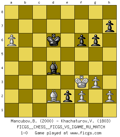Last move : 1-0 2007 December 18 19:5:35 [Event "FICGS__CHESS__FICGS_VS_IGAME_RU_MATCH"] [Site "FICGS"] [Date "2007.06.27"] [Round "2"] [White "Mancubov,Boris"] [Black "Khachaturov,Vadim"] [Result "1-0"] [WhiteElo "2000"] [BlackElo "1803"] 1.d4 Nf6 2.c4 g6 3.g3 Bg7 4.Nf3 O-O 5.Bg2 d5 6.cxd5 Nxd5 7.O-O Nc6 8.Nc3 Nb6 9.d5 Na5 10.Qc2 c6 11.dxc6 Nxc6 12.Rd1 Qc7 13.Nb5 Qb8 14.Bf4 e5 15.Be3 Bf5 16.Qc1 Rd8 17.Ng5 Nd4 18.Nxd4 exd4 19.Bf4 Qc8 20.Ne4 Bg4 21.Qxc8 Rdxc8 22.Nd6 Rc2 23.Rd2 Rxd2 24.Bxd2 Bxe2 25.Rc1 d3 26.b3 Bb2 27.Rc7 Be5 28.Rxb7 Bxd6 29.Rxb6 axb6 30.Bxa8 Kf8 31.Bd5 Ke7 32.Bc4 Bc5 33.b4 Bd4 34.Be3 Bc3 35.a3 Bb2 36.a4 Bc3 37.Bxb6 Bxb4 38.a5 Kd6 39.a6 Bc5 40.Ba5 f6 41.Bd2 Bd4 42.Kg2 Ke5 43.Bb5 Ke4 44.Bc6+ Ke5 45.Bf3 Kd6 46.Bxe2 dxe2 47.Kf3 1-0 King's Indian : 3.g3 Kingside Castling by player Black (move 4) Kingside Castling by player White (move 7) Player White won this chess game. Follow this game move after move (download)Chess is as much a mystery as women. (Purdy) Kein Großmeister ist normal. Sie unterscheiden sich nur im Ausmaß Ihrer Verrücktheit. (Viktor Kortschnoi) Con el tiempo, empecé a progresar en partidas decisivas. Tal vez porque me di cuenta de una simple verdad: no solo estaba yo nervioso sino también mi oponente. (Mikhail Tal) À la honte des hommes, on sait que les lois du jeu sont les seules qui soient partout justes, claires, inviolables et exécutées. Pourquoi l'Indien qui a donné les règles du jeu d'échecs est-il obéi de bon gré dans toute la terre, et que les décrétales des papes, par exemple, sont aujourd'hui un objet d'horreur et de mépris ? C'est que l'inventeur des échecs combina tout avec justesse pour la satisfaction des joueurs, et que les papes, dans leurs décrétales, n'eurent en vue que leur seul avantage. L'Indien voulut exercer également l'esprit des hommes et leur donner du plaisir; les papes ont voulu abrutir l'esprit des hommes. Voltaire (Dictionnaire philosophique / Garnier 1967) . 'gn is not allowed in chess unless n is an integer between 1 and 8 inclusive, where 1 and 8 are to interpreted as the standard numerals standing for integers in the ordered real-closed field R, with the *canonical* ordering. (As opposed to, say, an integer in the domain Z[2+i*sqrt(5)] or an integer in some exotic Grothendieck topos). (Normajean Yates)