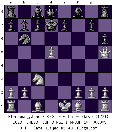 Last move : 0-1 2019 December 18 7:46:37 [Event "FICGS__CHESS__CUP_STAGE_1_GROUP_10__000003"] [Site "FICGS"] [Date "2019.11.02"] [Round "1"] [White "Rivenburg,John"] [Black "Vollmer,Steve"] [Result "0-1"] [WhiteElo "1020"] [BlackElo "1721"] 1.e4 Nf6 2.e5 Nd5 3.d4 d6 4.Nf3 Nc6 5.c4 Nb6 6.e6 fxe6 7.Nc3 h6 8.d5 exd5 9.cxd5 Ne5 10.Nxe5 dxe5 11.Qh5+ Kd7 12.Qxe5 Ke8 13.Qh5+ Kd7 0-1 This chess game has been lost on time (started : 2019.11.02 13:52:37) Alekhine's defense : Modern variation Player Black won this chess game. Follow this game move after move (download)All that matters on the Chessboard is good moves. (Bobby Fischer) Das Schach hält seine Meister in eigenen Banden, Fesseln; auf vielerlei Weise formt es ihren Geist, so dass die innere Freiheit selbst des Stärksten beeinflusst wird. (Albert Einstein) La caracteristica mas importante en la posición del Ajedrez es la actividad de las piezas. Esto es absolutamente fundamental en todas las fases del juego: Apertura, Juego Medio y especialmente Finales. La limitación primordial en la actividad de una pieza, es la estructuración de los Peones. (Michael Stean) Le plus grand jeu de l'esprit jamais inventé, plus vous l'apprenez, plus vous y prenez du plaisir. (Garry Kasparov) When the going gets tactical, the computers get going. (Hyatt)
