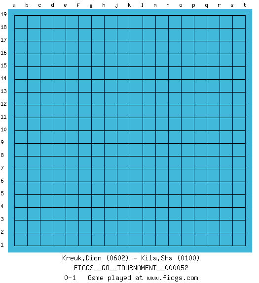 Last move : 0-1 2019 December 3 11:37:25 [Event "FICGS__GO__TOURNAMENT__000052"] [Site "FICGS"] [Date "2019.11.03"] [Round "1"] [Black "Kreuk,Dion"] [White "Kila,Sha"] [Result "0-1"] [Rating 1 "0602"] [Rating 2 "0100"] 0-1 This go game has been lost on time (started : 2019.11.03 8:1:25) Here are the names of the openings (joseki) played in the four corners : Player White won this Go (weiqi, baduk) game. Follow this game move after move (download)Don't reduce your own liberties. (Bill Taylor) To err is human, to shift the blame on someone else is tactical. (Mladen Jankovic)