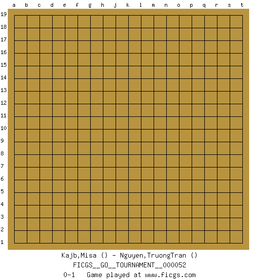 Last move : 0-1 2019 December 3 11:37:25 [Event "FICGS__GO__TOURNAMENT__000052"] [Site "FICGS"] [Date "2019.11.03"] [Round "1"] [Black "Kajb,Misa"] [White "Nguyen,TruongTran"] [Result "0-1"] 0-1 This go game has been lost on time (started : 2019.11.03 8:1:25) Here are the names of the openings (joseki) played in the four corners : Player White won this Go (weiqi, baduk) game. Follow this game move after move (download)Very few good moves are played. (Pierre Audouard) Opportunities multiply as they are seized. (Sun Tzu)