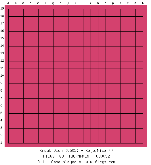 Last move : 0-1 2019 December 3 11:37:25 [Event "FICGS__GO__TOURNAMENT__000052"] [Site "FICGS"] [Date "2019.11.03"] [Round "1"] [Black "Kreuk,Dion"] [White "Kajb,Misa"] [Result "0-1"] [Rating 1 "0602"] 0-1 This go game has been lost on time (started : 2019.11.03 8:1:25) Here are the names of the openings (joseki) played in the four corners : Player White won this Go (weiqi, baduk) game. Follow this game move after move (download)If a formation is symmetrical, play at the center. (Anonymous) Establishing goals is all right if you don't let them deprive you of interesting detours. (Doug Larson)