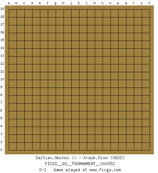 Last move : 0-1 2019 December 3 11:37:25 [Event "FICGS__GO__TOURNAMENT__000052"] [Site "FICGS"] [Date "2019.11.03"] [Round "1"] [Black "Saitiev,Aminov"] [White "Kreuk,Dion"] [Result "0-1"] [Rating 2 "0602"] 0-1 This go game has been lost on time (started : 2019.11.03 8:1:25) Here are the names of the openings (joseki) played in the four corners : Player White won this Go (weiqi, baduk) game. Follow this game move after move (download)Never try to cut bamboo joints. (Anonymous) Tree pose grows confidence. It roots me to this world. (Terri Guillemets)