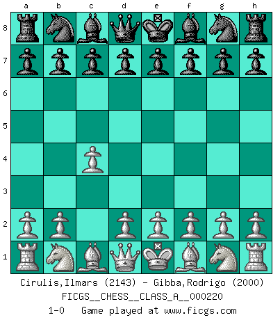 Last move : 1-0 2019 December 18 7:46:37 [Event "FICGS__CHESS__CLASS_A__000220"] [Site "FICGS"] [Date "2019.11.03"] [Round "1"] [White "Cirulis,Ilmars"] [Black "Gibba,Rodrigo"] [Result "1-0"] [WhiteElo "2143"] [BlackElo "2000"] 1.c4 1-0 This chess game has been lost on time (started : 2019.11.03 18:8:26) English Opening Player White won this chess game. Follow this game move after move (download)The enormous mental resilience, without which no Chess player can exist, was so much taken up by Chess that he could never free his mind of this game. (Albert Einstein) Kostenjuk hat keinen Sexappeal. (Loek van Wely) El juego del Ajedrez no es solamente una diversión quieta; algunas cualidades muy valuables de la mente se pueden adquirir y cultivar con el, como convertirlos en habitos disponibles para toda ocasión; ya que la vida es algo así como el Ajedrez. (Benjamin Franklin) Votre seul travail dans les ouvertures est d'obtenir un milieu de partie jouable. (Lajos Portish) It's not the will to win, but the will to prepare to win that makes the difference. (Bear Bryant)