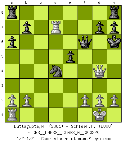 Last move : 1/2-1/2 2020 January 15 6:2:45 [Event "FICGS__CHESS__CLASS_A__000220"] [Site "FICGS"] [Date "2019.11.03"] [Round "1"] [White "Duttagupta,Aniruddha"] [Black "Schleef,Harald"] [Result "1/2-1/2"] [WhiteElo "2081"] [BlackElo "2000"] 1.e4 c5 2.d4 cxd4 3.c3 dxc3 4.Nxc3 e6 5.Nf3 a6 6.Bc4 Nc6 7.O-O d6 8.Qe2 Be7 9.Rd1 Qc7 10.Bf4 Nf6 11.e5 Nh5 12.Bg5 Bxg5 13.Nd5 Qd8 14.Nxg5 Nf4 15.Qf3 dxe5 16.Nxf7 Kxf7 17.Nxf4 Qf6 18.Nxe6 Bxe6 19.Bxe6+ Kxe6 20.Qb3+ Kf5 21.Rd7 Nd4 22.Qh3+ Kg6 23.Qg4+ Kh6 1/2-1/2 Sicilian : Smith-Morra gambit Kingside Castling by player White (move 7) This chess game ended in a draw. Follow this game move after move (download)Place the contents of the Chess box in a hat, shake them up vigorously, pour them on the board from a height of two feet, and you get the style of Steinitz. (H. E. Bird) Wer der Ansicht ist, daß alle Schachspieler verrückt sind, wird durch Studium des Lebens von Emil Josef Diemer nicht auf andere Gedanken kommen. (Hans Ree) El Ajedrez es parte de una cultura y si una cultura esta en decadencia, entonces también el Ajedrez declinará. (Mikhail Botvinnik) J'ai toujours senti une vague pitié pour l'homme qui ne connaît rien aux échecs, tout comme j'en aurais pour un homme ignorant de l'amour. Les Echecs, comme la musique ou comme l'amour, ont le pouvoir de rendre heureux. (Siegbert Tarrasch) Chess is as much a mystery as women. (Purdy)