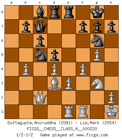 Last move : 1/2-1/2 2020 April 24 21:10:57 [Event "FICGS__CHESS__CLASS_A__000220"] [Site "FICGS"] [Date "2019.11.03"] [Round "1"] [White "Duttagupta,Aniruddha"] [Black "Lim,Mark"] [Result "1/2-1/2"] [WhiteElo "2081"] [BlackElo "2054"] 1.d4 Nf6 2.c4 e6 3.Nc3 d5 4.cxd5 exd5 5.Bg5 c6 6.Qc2 Nbd7 7.e3 Be7 8.Bd3 O-O 9.Nge2 Re8 10.O-O Nf8 11.f3 Be6 12.Rad1 Rc8 13.Kh1 a6 14.a3 Ng6 15.Na4 Nh5 16.Bxe7 Qxe7 17.g4 Nf6 18.Nc5 Rcd8 19.Rde1 Bc8 20.Ng3 Qc7 21.b4 a5 22.g5 Nd7 23.f4 axb4 24.axb4 Nxc5 1/2-1/2 Queen's pawn game Kingside Castling by player Black (move 8) Kingside Castling by player White (move 10) This chess game ended in a draw. Follow this game move after move (download)Chess is a sea in which a gnat may drink and an elephant may bathe. (Hindu proverb) Sicherlich können nur Meister einen Stil haben. Daß ein nicht-Meister auch nur ein einziges Mal in seinem Leben eine Partie folgerecht durchführte, habe ich niemals bemerkt. (Emanuel Lasker) Bobby Fischer es el mas grande genio de Ajedrez de todos los tiempos. (Alexander Kotov) Je ne crois pas en la psychologie, je crois aux bons coups. (Robert Fischer) Never risk one's whole fortune unless supported by one's entire army. (Niccolo Machiavelli)