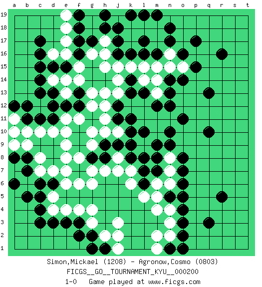 Last move : 1-0 2020 March 31 5:9:47 [Event "FICGS__GO__TOURNAMENT_KYU__000200"] [Site "FICGS"] [Date "2019.11.06"] [Round "1"] [Black "Simon,Mickael"] [White "Agronow,Cosmo"] [Result "1-0"] [Rating 1 "1208"] [Rating 2 "0803"] 1.r16 d4 2.q3 d16 3.p17 d10 4.r5 m4 5.q10 j3 6.f16 f14 7.c14 d14 8.c17 n15 9.c16 h15 10.e15 e14 11.d15 h17 12.c3 d7 13.d3 f4 14.c4 e4 15.b7 b10 16.q13 m17 17.k10 j10 18.k9 j8 19.j11 h11 20.j9 h10 21.k11 h13 22.h9 g9 23.h8 g6 24.g8 f8 25.f9 g10 26.f7 e8 27.f10 f11 28.k13 k12 29.j12 l12 30.l7 l8 31.k8 j7 32.m8 l9 33.l13 k7 34.m7 h12 35.n5 m5 36.k16 k17 37.m16 n16 38.l17 m15 39.l16 g7 40.n17 m18 41.n18 l18 42.j17 k18 43.j16 h16 44.j18 j19 45.h18 g18 46.h19 g19 47.m19 j13 48.m12 l11 49.l10 m10 50.m9 m11 51.n12 h7 52.g17 l15 53.l19 l9 54.l8 n6 55.o5 m6 56.o7 n7 57.o8 n8 58.n9 n11 59.o11 k15 60.k19 j15 61.c11 c10 62.d11 e10 63.l6 l5 64.g2 m13 65.c5 d5 66.c6 c7 67.b8 c8 68.c13 g16 69.f17 k6 70.n10 f15 71.f3 g3 72.f2 h2 73.o3 n3 74.o2 n2 75.o6 n4 76.o4 e16 77.c15 e9 78.o16 j14 79.o14 o15 80.p15 l14 81.n13 m14 82.d6 e6 83.e12 e11 84.f12 g12 85.d13 e13 86.n1 m1 87.o1 m2 88.b11 b9 89.f13 g13 90.d12 a11 91.a12 a10 92.b12 e17 93.f18 e18 94.f19 e7 95.e3 g4 96.h1 j1 97.g1 j2 98.a8 b6 99.b5 a9 100.a6 f6 101.n14 e19 102.k14 1-0 Here are the names of the openings (joseki) played in the four corners : Corner d16 : d16 f16 Hoshi (Hwajeom, Seongjeom, Xingwei`) 4-4 Point. The star or hoshi (4-4) point, emphasizing influence at the potential expense of territory. Ikken Takagakari (Hankan Nop'dakeolch'im, Yi Gaojia, 1-Space High Approach). White typically responds at 6-4 or 3-10. White 4-10 is played when White finds play on the right side advantageous. White 4-8 or 3-8 may be played when White has support at top. Player Black won this Go (weiqi, baduk) game. Follow this game move after move (download)Go is essentially a form of harmony. Go in the 21st century will have to be go of the 'harmony of the six points - the four quarters, the above and the below.' As in life we will need to view the whole rather than the part. Japanese go has focused too heavily on the local (joseki) rather than the whole for 300 years. The reason the Chinese and Koreans are overtaking the Japanese is that they are closer to achieve this whole-board view. (Go Seigen, 9p, 1994) Lamb in skin of tiger, still fears the wolf. (Chinese proverb)