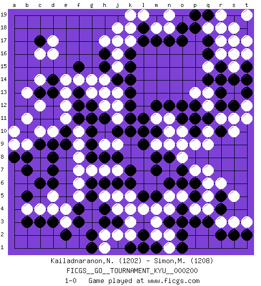 Last move : 1-0 2020 March 1 22:6:52 [Event "FICGS__GO__TOURNAMENT_KYU__000200"] [Site "FICGS"] [Date "2019.11.06"] [Round "1"] [Black "Kailadnaranon,Nanthwat"] [White "Simon,Mickael"] [Result "1-0"] [Rating 1 "1202"] [Rating 2 "1208"] 1.q16 d4 2.q3 d16 3.f3 q5 4.r5 r6 5.r4 q7 6.o3 r11 7.r14 r17 8.q17 r16 9.r15 q18 10.p18 r18 11.o17 c14 12.c3 c4 13.d3 e4 14.f4 f5 15.g5 f6 16.g6 f7 17.c9 e3 18.e2 s15 19.s14 t16 20.b3 b4 21.c17 d17 22.k16 g7 23.h4 k3 24.l5 k5 25.k6 j5 26.j6 l4 27.m5 n4 28.p6 m4 29.n6 h2 30.j3 j2 31.g2 m2 32.n3 m3 33.l2 k2 34.l1 o5 35.o6 q6 36.p5 j4 37.h3 n2 38.o2 h1 39.m1 n1 40.k1 c16 41.d6 c7 42.d7 c8 43.d8 b9 44.b10 c10 45.d9 b11 46.b8 a10 47.b7 d5 48.c6 f10 49.e10 f9 50.f11 e11 51.b5 g11 52.f12 j9 53.l9 j11 54.c13 d10 55.e9 b13 56.d14 c12 57.d13 e12 58.g12 h12 59.g10 g14 60.h11 h13 61.h8 h9 62.g9 f8 63.g8 h7 64.j8 j7 65.k7 e13 66.j10 h17 67.k11 q9 68.q11 o9 69.r12 p4 70.p3 s11 71.p10 p9 72.k13 q12 73.p12 k18 74.l18 k17 75.l17 o10 76.o11 q4 77.o4 n5 78.m7 r3 79.r2 s3 80.s2 t3 81.t2 s5 82.o1 j16 83.k15 j12 84.k12 q13 85.r13 n11 86.n12 m11 87.m12 l10 88.k10 l19 89.m19 k19 90.m10 n10 91.l11 h5 92.h6 k4 93.q19 r19 94.p19 m9 95.t18 t17 96.s16 s17 97.t14 s18 98.t15 t19 99.s12 q10 100.p11 t12 101.t13 t11 102.h15 j15 103.j14 h14 104.j17 j18 105.h16 j17 106.f15 p13 107.o12 q15 108.q14 m18 109.m17 n18 110.n17 j13 111.k14 f14 112.m8 l10 113.n8 p7 114.m10 n9 115.a8 a9 116.o18 n19 117.o7 o8 118.f13 g13 119.g11 e14 120.g1 l10 121.r10 s10 122.m10 s16 123.l10 1-0 Here are the names of the openings (joseki) played in the four corners : Corner d4 : d4 f3 Hoshi (Hwajeom, Seongjeom, Xingwei`) 4-4 Point. The star or hoshi (4-4) point, emphasizing influence at the potential expense of territory. Ikken Kakari (Hankan Keolch'im, Yi Gua`jiao~, 1-Space Low Approach). Black 2 is the standard approach move to the 4-4. Corner q4 : q3 q5 Komoku (Somok, Xiao~mu`) 3-4 Point. The komoku (3-4) point is the traditional corner enclosure move.. Ikken Takagakari (Hankan Nop'dakeolch'im, Yi Gaogua`jiao~, 1-Space High Approach). The 5-4 approach move has become more popular in modern times, as modern Go emphasizes speed and influence. Corner q16 : q16 r11 Hoshi (Hwajeom, Seongjeom, Xingwei`) 4-4 Point. The star or hoshi (4-4) point, emphasizing influence at the potential expense of territory. Player Black won this Go (weiqi, baduk) game. Follow this game move after move (download)In the sound of the stone you can hear its purpose. (Pierre Audouard) The only sure thing about luck is that it will change. (Wilson Mizner)