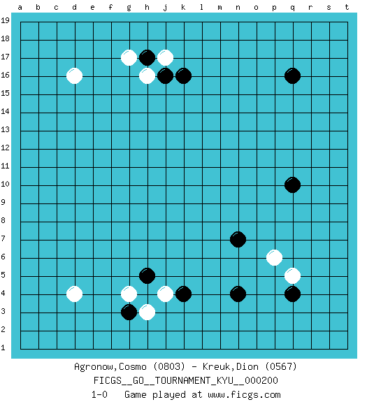 Last move : 1-0 2020 January 8 15:1:18 [Event "FICGS__GO__TOURNAMENT_KYU__000200"] [Site "FICGS"] [Date "2019.11.06"] [Round "1"] [Black "Agronow,Cosmo"] [White "Kreuk,Dion"] [Result "1-0"] [Rating 1 "0803"] [Rating 2 "0567"] 1.q16 d4 2.q4 d16 3.g3 h3 4.h17 h16 5.k16 j17 6.j16 g17 7.h5 g4 8.k4 j4 9.q10 p6 10.n7 q5 11.n4 1-0 This go game has been lost on time (started : 2019.11.06 5:10:8) Here are the names of the openings (joseki) played in the four corners : Corner d4 : d4 g3 Hoshi (Hwajeom, Seongjeom, Xingwei`) 4-4 Point. The star or hoshi (4-4) point, emphasizing influence at the potential expense of territory. Niken Kakari (Dukan Keolch'im, E`r Gua`jiao~, 2-Space Low Approach). White typically answers by 7-3 or 3-5 (which is not joseki). Corner d16 : d16 h17 Hoshi (Hwajeom, Seongjeom, Xingwei`) 4-4 Point. The star or hoshi (4-4) point, emphasizing influence at the potential expense of territory. Corner q4 : q4 p6 Hoshi (Hwajeom, Seongjeom, Xingwei`) 4-4 Point. The star or hoshi (4-4) point, emphasizing influence at the potential expense of territory. Player Black won this Go (weiqi, baduk) game. Follow this game move after move (download)Big groups never die. (Anonymous) Macintosh - we might not get everything right, but at least we knew the century was going to end. (Douglas Adams)