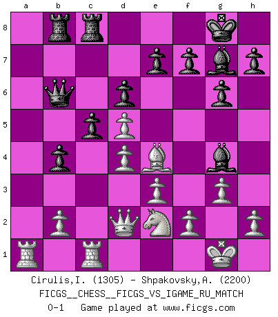Last move : 0-1 2007 August 11 13:36:46 [Event "FICGS__CHESS__FICGS_VS_IGAME_RU_MATCH"] [Site "FICGS"] [Date "2007.06.27"] [Round "1"] [White "Cirulis,Ilmars"] [Black "Shpakovsky,Alexander"] [Result "0-1"] [WhiteElo "1305"] [BlackElo "2200"] 1.c4 c5 2.g3 Nc6 3.Bg2 g6 4.Nh3 Bg7 5.O-O Nf6 6.Nc3 O-O 7.d3 d6 8.Nf4 Bd7 9.Bd2 Rb8 10.e3 a6 11.Ncd5 Nxd5 12.cxd5 Ne5 13.Bc3 b5 14.a3 a5 15.Ne2 b4 16.axb4 axb4 17.Bxe5 Bxe5 18.d4 Bg7 19.Qd2 Qb6 20.Rfc1 Rfc8 21.Be4 Bg4 0-1 English : Symmetrical variation Kingside Castling by player White (move 5) Kingside Castling by player Black (move 6) Player Black won this chess game. Follow this game move after move (download)Alekhine is a poet who creates a work of art out of something that would hardly inspire another man to send home a picture post card. (Max Euwe) Ich brauche nur einen Blick auf das Schachbrett zu werfen, und weiß schon, was in der Stellung steckt, was geschehen kann und was geschehen wird. Alle übrigen suchen und prüfen, ich aber weiß es! (José Raúl Capablanca) Aún deseo matar a Fischer. (Boris Spassky) Les pièces de l'échiquier étaient impitoyables. Elles le retenaient, elles l'absorbaient. Il y avait de l'horreur en cela, mais aussi une harmonie unique. Car, qu'y a-t-il dans le monde, à part les échecs ? (V. Nabokov) Now the reason the enlightened prince and the wise general conquer the enemy whenever they move and their achievements surpass those of ordinary men is foreknowledge. (Sun Tzu)