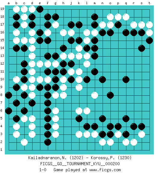 Last move : 1-0 2019 December 31 7:58:4 [Event "FICGS__GO__TOURNAMENT_KYU__000200 "] [Site "FICGS"] [Date "2019.11.06"] [Round "1"] [Black "Kailadnaranon,Nanthwat "] [White "Korossy,Peter "] [Result "1-0"] [Rating 1 "1202"] [Rating 2 "1230"] 1.q16 d4 2.r4 p3 3.q5 r2 4.c16 e17 5.c3 d3 6.c4 c5 7.b5 b6 8.c6 d5 9.b7 b4 10.a6 b3 11.n3 n4 12.m4 m3 13.o4 n2 14.o3 o2 15.n5 l3 16.l4 k3 17.q10 o17 18.m17 q18 19.o16 r17 20.r16 n17 21.n16 m16 22.p17 p18 23.s16 s17 24.m18 o18 25.m15 l16 26.j17 j16 27.k17 l15 28.m14 h16 29.g18 g17 30.f18 e18 31.f17 f16 32.e16 d16 33.e15 d15 34.d17 c17 35.d18 c18 36.e19 c15 37.b14 b15 38.c11 h13 39.h11 j11 40.j10 k11 41.m11 l13 42.m13 l12 43.n10 h10 44.g10 h9 45.g11 k9 46.g9 h8 47.f7 g6 48.f6 g5 49.l10 k10 50.f5 g4 51.f2 c2 52.f4 g3 53.f3 m8 54.o8 d13 55.f15 d11 56.c12 d12 57.c14 d14 58.f13 d10 59.c10 t16 60.t15 t17 61.s14 f12 62.g13 g12 63.h12 g8 64.f8 s3 65.s4 c9 66.b9 d8 67.e9 d9 68.d7 f10 69.f11 e12 70.b18 b19 71.b17 b16 72.c19 d19 73.l14 k14 74.c19 b8 75.a8 d19 76.h14 j13 77.c19 b10 78.c8 d19 79.k15 c19 80.j12 k13 81.j15 e10 82.f9 l6 83.k5 k6 84.q3 q2 85.p4 1-0 Here are the names of the openings (joseki) played in the four corners : Corner q4 : r4 p3Komoku (Somok, Xiao~mu`) 3-4 Point. The komoku (3-4) point is the traditional corner enclosure move..Ikken Kakari (Hankan Keolch'im, Yi Gua`jiao~, 1-Space Low Pincer). The small knight move is the basic approach move to the 3-4 point stone. It has been continually used for over four centuries. There are limitless variations, with new moves constantly being discovered. White 2 opens the door to a treaure store of joseki. Corner d16 : c16 e17Komoku (Somok, Xiao~mu`) 3-4 Point. The komoku (3-4) point is the traditional corner enclosure move..Ikken Kakari (Hankan Keolch'im, Yi Gua`jiao~, 1-Space Low Pincer). The small knight move is the basic approach move to the 3-4 point stone. It has been continually used for over four centuries. There are limitless variations, with new moves constantly being discovered. White 2 opens the door to a treaure store of joseki. Corner d4 : d4 c3Hoshi (Hwajeom, Seongjeom, Xingwei`) 4-4 Point. The star or hoshi (4-4) point, emphasizing influence at the potential expense of territory. Corner q16 : q16 o17Hoshi (Hwajeom, Seongjeom, Xingwei`) 4-4 Point. The star or hoshi (4-4) point, emphasizing influence at the potential expense of territory.Ikken Kakari (Hankan Keolch'im, Yi Gua`jiao~, 1-Space Low Approach). White 2 is the standard approach move to the 4-4. Player Black won this Go (weiqi, baduk) game.Follow this game move after move (download ) Knight's moves win running battles. (Anonymous) I would love to change the world, but they won't give me the source code. (Unknown)