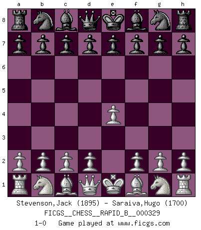 Last move : 1-0 2019 December 7 11:56:4 [Event "FICGS__CHESS__RAPID_B__000329"] [Site "FICGS"] [Date "2019.11.06"] [Round "1"] [White "Stevenson,Jack"] [Black "Saraiva,Hugo"] [Result "1-0"] [WhiteElo "1895"] [BlackElo "1700"] 1.e4 1-0 This chess game has been lost on time (started : 2019.11.06 22:53:5) King's pawn Opening Player White won this chess game. Follow this game move after move (download)Who is your opponent tonight, tonight I am playing against the Black pieces. (Akiba Rubinstein) Ich habe Putins Aufstieg an die Macht beobachtet und seine Politik, die demokratischen Institutionen meines Landes zu zerstören. (Garry Kasparov) Los finales de Peón son del Ajedrez lo que el cesped es del Golf. (Cecil Purdy) Le jeu d'échecs fait naître et fortifie en nous plusieurs qualités précieuses dans le cours de l'existence, telles que la prévoyance, la circonspection, la prudence, et la persévérance. (Benjamin Franklin - 1783, la morale des échecs) Do you know these so called Volunteers don't even get paid! (Simpsons)