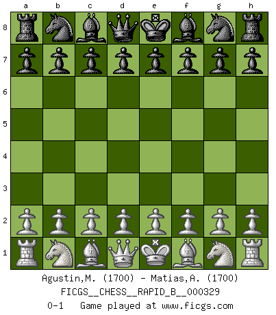 Last move : 0-1 2019 December 7 11:56:4 [Event "FICGS__CHESS__RAPID_B__000329"] [Site "FICGS"] [Date "2019.11.06"] [Round "1"] [White "Agustin,Mark Caesar"] [Black "Matias,Anthony"] [Result "0-1"] [WhiteElo "1700"] [BlackElo "1700"] 0-1 This chess game has been lost on time (started : 2019.11.06 22:53:5) Player Black won this chess game. Follow this game move after move (download)You can only get good at Chess if you love the game. (Bobby Fischer) Computer sind die einzigen Gegner, die nicht immer eine Ausrede auf Lager haben, wenn sie gegen mich verlieren. (Robert James Fischer) El Ajedrez es imaginación. (David Bronstein) Echiquier : carré parfait, comme la Jérusalem nouvelle décrite par l'auteur de l'Apocalypse, huit cases sur huit, exaltation du chiffre 4, symbole du cosmos aux quatre horizons... où le noir et le blanc, l'ombre et la lumière, le mal et le bien s'entremêlent et se conjuguent. (Robert Couffignal, Le Gambit du poète) Pushing plastic is for the many, pushing virtual pieces is for the fewer, pushing wood is for the very few. (Normajean Yates)