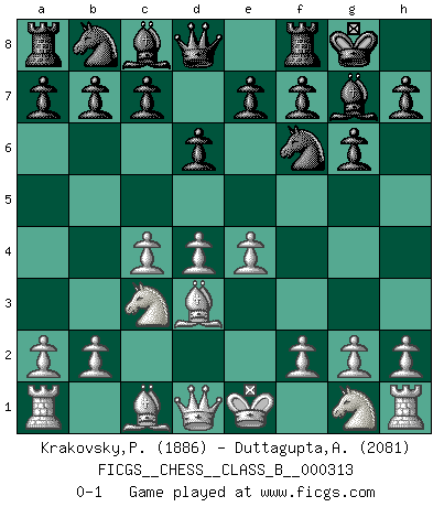 Last move : 0-1 2019 December 22 12:0:26 [Event "FICGS__CHESS__CLASS_B__000313"] [Site "FICGS"] [Date "2019.11.10"] [Round "1"] [White "Krakovsky,Peter"] [Black "Duttagupta,Aniruddha"] [Result "0-1"] [WhiteElo "1886"] [BlackElo "2081"] 1.d4 Nf6 2.c4 g6 3.Nc3 Bg7 4.e4 d6 5.Bd3 O-O 0-1 This chess game has been lost on time (started : 2019.11.10 17:53:12) King's Indian : 4.e4 Kingside Castling by player Black (move 5) Player Black won this chess game. Follow this game move after move (download)Chess teaches you to control the initial excitement you feel when you see something that looks good and it trains you to think objectively when you're in trouble. (Stanley Kubrick) Weshalb minderdergeübte Spieler mit g2-g4 beginnen? Die betreffenden sind unschlüssig, ob sie nun rechts (h4) oder links (f4) beginnen sollen, und in ihrer Ratlosigkeit entschliessen sie sich nach guter Bürgerart dazu, den goldenen Mittelweg zu wählen. (Aaron Nimzowitsch) El Ajedrez es sobre todo, ¡una pelea!. (Emanuel Lasker) Aidez vos pièces, elles vous aideront. (Paul Morphy) There are two kinds of tragedy in this world, one is not getting what you want and the other is getting. (Lord of war)