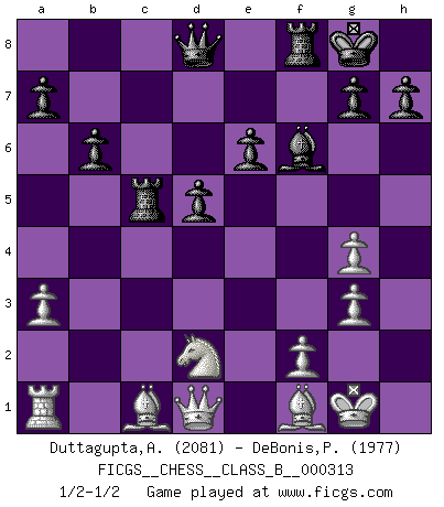 Last move : 1/2-1/2 2020 May 1 17:23:37 [Event "FICGS__CHESS__CLASS_B__000313"] [Site "FICGS"] [Date "2019.11.10"] [Round "1"] [White "Duttagupta,Aniruddha"] [Black "DeBonis,Patrick"] [Result "1/2-1/2"] [WhiteElo "2081"] [BlackElo "1977"] 1.Nf3 Nf6 2.c4 e6 3.g3 d5 4.d4 Bb4+ 5.Bd2 Be7 6.Bg2 O-O 7.O-O c6 8.Qc2 b6 9.Bf4 Nbd7 10.Rd1 Ba6 11.cxd5 cxd5 12.Ne5 Nxe5 13.dxe5 Ng4 14.h3 Rc8 15.Qa4 Bxe2 16.hxg4 Rc4 17.Qb3 Rb4 18.Qc2 Bxd1 19.Qxd1 Rxb2 20.Bc1 Rb4 21.a3 Rb5 22.Bf1 Rc5 23.Nd2 f6 24.exf6 Bxf6 1/2-1/2 Reti Opening Kingside Castling by player Black (move 6) Kingside Castling by player White (move 7) This chess game ended in a draw. Follow this game move after move (download)Suddenly it was obvious to me in my analysis I had missed what Fischer had found with the greatest of ease at the board. (Mikhail Botvinnik) Die unerbitterlichsten Regeln im Schach sind die Ausnahmen. (Savielly Grigorievitsch Tartakower) El Ajedrez es 99 por ciento táctica. (Teichmann) Tout change constamment, y compris dans le monde des Echecs. (Botvinnik) Nothing is more important for teaching us to understand the concepts we have than constructing fictitious ones. (Ludwig Wittgenstein)