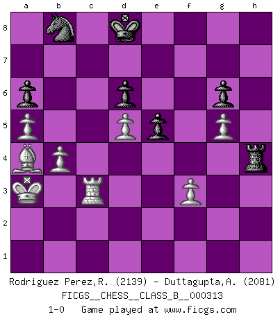 Last move : 1-0 2020 September 16 14:28:35 [Event "FICGS__CHESS__CLASS_B__000313"] [Site "FICGS"] [Date "2019.11.10"] [Round "1"] [White "Rodriguez Perez,Rene"] [Black "Duttagupta,Aniruddha"] [Result "1-0"] [WhiteElo "2139"] [BlackElo "2081"] 1.e4 d6 2.d4 Nf6 3.f3 c5 4.dxc5 Qa5+ 5.Nc3 Qxc5 6.Qd3 a6 7.Be3 Qa5 8.Nge2 Nbd7 9.Nd4 e6 10.g4 h6 11.O-O-O b5 12.a3 Bb7 13.Kb1 Qc7 14.Bf2 Be7 15.Qd2 g6 16.Rg1 e5 17.Nb3 Kf8 18.Be3 Rd8 19.Bxh6+ Kg8 20.Na5 Ba8 21.g5 Nh5 22.Nd5 Bxd5 23.exd5 Bf8 24.Nc6 Re8 25.Bxf8 Kxf8 26.c4 bxc4 27.Bxc4 Nc5 28.Rg4 Qb6 29.Ka2 Ng7 30.b4 Nd7 31.Bd3 Rh3 32.Qg2 Rh5 33.a4 Nf5 34.a5 Qb7 35.Qf2 Ne7 36.Nxe7 Kxe7 37.Qe2 Ra8 38.h4 R5h8 39.Bc2 f5 40.Rc4 Rhc8 41.Ba4 Rxc4 42.Qxc4 Rc8 43.Bc6 Qa7 44.Qe2 Rh8 45.Qe1 f4 46.Ka3 Qe3+ 47.Qxe3 fxe3 48.Re1 Nb8 49.Ba4 Rxh4 50.Rxe3 Kd8 51.Rc3 1-0 King's pawn Opening Queenside Castling by player White (move 11) Player White won this chess game. Follow this game move after move (download)Bobby just drops the pieces and they fall on the right squares. (Miguel Najdorf) Sie bekommen vielleicht den Eindruck, dass die Spitzenspieler überhaupt gar nicht so stark sind. Aber das stimmt nicht. Es ist eine Illusion. Mit einem Computer an der Seite ist es sehr leicht, Urteile zu fällen, aber wenn man alleine am Brett sitzt, sieht die Sache ganz anders aus. (Vladimir Kramnik) El Ajedrez es el gimnasio de la mente. (Blaise Pascal) On peut tirer plus d'utilité d'une partie perdue que de 100 parties gagnées. (Capablanca) Without deviation from the norm, progress is not possible. (Frank Zappa)