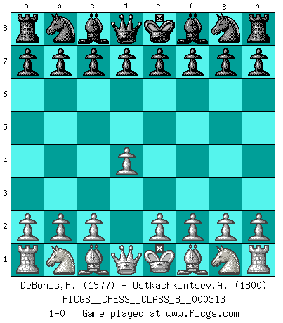 Last move : 1-0 2019 December 21 7:42:47 [Event "FICGS__CHESS__CLASS_B__000313"] [Site "FICGS"] [Date "2019.11.10"] [Round "1"] [White "DeBonis,Patrick"] [Black "Ustkachkintsev,Andrey"] [Result "1-0"] [WhiteElo "1977"] [BlackElo "1800"] 1.d4 1-0 This chess game has been lost on time (started : 2019.11.10 17:53:12) Queen's pawn Player White won this chess game. Follow this game move after move (download)A good sacrifice is one that is not necessarily sound but leaves your opponent dazed and confused. (Rudolph Spielmann) Wir irren allesamt, nur jeder irrt anders. (Georg Christoph Lichtenberg) Un Peón pasado aumenta su poder a medida de que el número de piezas en el tablero disminuye. (Capablanca) Karpov est une pièce de musée. (Garry Kasparov) You can only get smarter by playing a smarter opponent. (Revolver, movie)