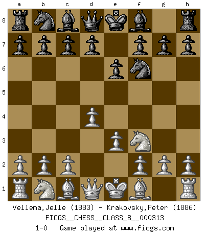 Last move : 1-0 2019 December 22 12:0:26 [Event "FICGS__CHESS__CLASS_B__000313"] [Site "FICGS"] [Date "2019.11.10"] [Round "1"] [White "Vellema,Jelle"] [Black "Krakovsky,Peter"] [Result "1-0"] [WhiteElo "1883"] [BlackElo "1886"] 1.d4 Nf6 2.Nf3 e6 3.e3 1-0 This chess game has been lost on time (started : 2019.11.10 17:53:12) Queen's pawn : Yusupov-Rubinstein system Player White won this chess game. Follow this game move after move (download)If you aren't afraid of Spassky, then I have removed the element of money. (Jim Slater) Wenn sie aufgeben, dann danke ich Ihnen für das Spiel (Eventualzug beim Fernschach). (Anonymous) ¿Porque tengo que perder ante este idiota?. (Aron Nimzovich) Les échecs sont plus proches de l'art de l'assassinat que de l'art de la guerre. (Arturo Perez-Reverte) Whatever you do, don't be bored. This is absolutely the most exciting time we could have possibly hoped to be alive. And things are just starting. (From movie Waking life)