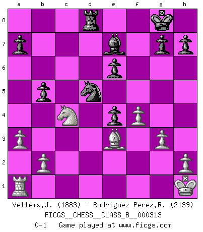 Last move : 0-1 2020 April 6 21:17:54 [Event "FICGS__CHESS__CLASS_B__000313"] [Site "FICGS"] [Date "2019.11.10"] [Round "1"] [White "Vellema,Jelle"] [Black "Rodriguez Perez,Rene"] [Result "0-1"] [WhiteElo "1883"] [BlackElo "2139"] 1.d4 e6 2.Nf3 c5 3.e3 Nf6 4.Bd3 d5 5.c3 b6 6.Nbd2 Be7 7.Ne5 O-O 8.O-O Bb7 9.Qe2 Ne4 10.f3 Nd6 11.f4 f6 12.Nef3 Ne4 13.c4 f5 14.Ne5 cxd4 15.exd4 dxc4 16.Bxc4 Qxd4+ 17.Kh1 Bd5 18.Nxe4 Qxe4 19.Qxe4 fxe4 20.Rd1 Bxc4 21.Nxc4 Na6 22.Rd7 Rfd8 23.Rxd8+ Rxd8 24.Be3 Nb4 25.g3 b5 26.a3 Nd5 0-1 Queen's pawn Kingside Castling by player Black (move 7) Kingside Castling by player White (move 8) Player Black won this chess game. Follow this game move after move (download)A win by an unsound combination, however showy, fills me with artistic horror. (Wilhelm Steinitz) Ich trinke, ich rauche, ich spiele, ich liebe Frauen aber Fernschach ist ein Laster, das ich nicht habe. (Mikhail Nekhemyevich Tal) El Ajedrez es una manera fabulosa para que los niños aprendan a autovalorarse y a autoestimarse. (Saudin Robovic) En blitz, le Cavalier l'emporte sur le Fou. (Vlastimil Hort) The best teachers teach from the heart, not from the book. (Author unknown)