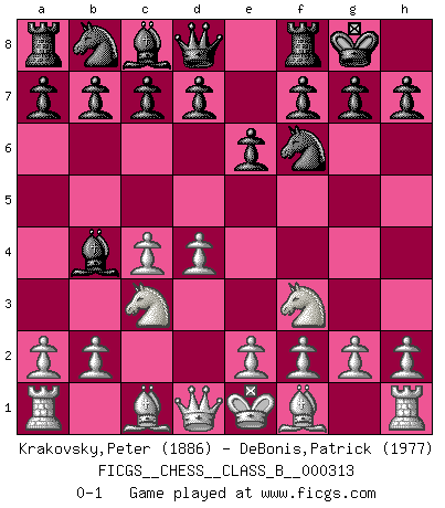 Last move : 0-1 2019 December 24 18:31:13 [Event "FICGS__CHESS__CLASS_B__000313"] [Site "FICGS"] [Date "2019.11.10"] [Round "1"] [White "Krakovsky,Peter"] [Black "DeBonis,Patrick"] [Result "0-1"] [WhiteElo "1886"] [BlackElo "1977"] 1.d4 Nf6 2.c4 e6 3.Nc3 Bb4 4.Nf3 O-O 0-1 This chess game has been lost on time (started : 2019.11.10 17:53:12) Nimzo-Indian : Three knights variation Kingside Castling by player Black (move 4) Player Black won this chess game. Follow this game move after move (download)The laws of Chess do not permit a free choice: you have to move whether you like it or not. (Emanuel Lasker) Die Fehler sind da, Sie warten nur darauf gemacht zu werden. (Savielly Grigorievitsch Tartakower) Hay dos clases de hombres: aquellos que se conforman en dejarse llevar por las circunstancias y que juegan barajas y aquellos decididos a controlar las circunstancias y que juegan al Ajedrez. (Mortimer Collins) Je ne suis pas le dernier à jouer lâchement des coups douteux pendant le zeïtnot de l'adversaire pour l'achever: en effet les coups qui font le plus peur sont ceux que l'on ne comprend pas. Je me fais souvent peur quand je joue. (Un professeur anonyme) Life is like a game of cards: the hand you are dealt represents determinism; the way you play it is free will. (Jawaharlal Nehru)