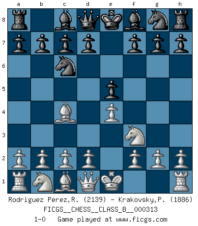 Last move : 1-0 2019 December 25 9:7:32 [Event "FICGS__CHESS__CLASS_B__000313"] [Site "FICGS"] [Date "2019.11.10"] [Round "1"] [White "Rodriguez Perez,Rene"] [Black "Krakovsky,Peter"] [Result "1-0"] [WhiteElo "2139"] [BlackElo "1886"] 1.e4 e5 2.Nf3 Nc6 3.Bc4 1-0 This chess game has been lost on time (started : 2019.11.10 17:53:12) King's pawn game Player White won this chess game. Follow this game move after move (download)In Chess, as it is played by masters, chance is practically eliminated. (Emanuel Lasker) Ich moechte nie einem Club beitreten, der Leute wie mich als Mitglieder aufnimmt. (Woody Allen) Nada excita más a Grandes Maestros aburridos que una novedad teórica. (Dominic Lawson) Les échecs sont un jeu terrible. Si vous n'avez pas le centre, votre adversaire a une position plus libre. Par contre, si vous avez le centre, alors vous avez vraiment quelque chose pour laquelle vous inquiéter ! (Siegbert Tarrasch) Wisdom is the reward you get for a lifetime of listening when you'd have preferred to talk. (Doug Larson)
