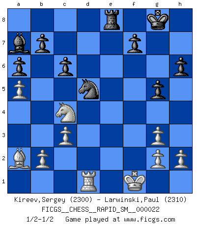 Last move : 1/2-1/2 2019 November 24 14:33:39 [Event "FICGS__CHESS__RAPID_SM__000022"] [Site "FICGS"] [Date "2019.11.11"] [Round "1"] [White "Kireev,Sergey"] [Black "Larwinski,Paul"] [Result "1/2-1/2"] [WhiteElo "2300"] [BlackElo "2310"] 1.e4 e5 2.Nf3 Nc6 3.Bc4 Bc5 4.O-O Nf6 5.d3 d6 6.c3 a6 7.a4 O-O 8.Bg5 h6 9.Bh4 Ba7 10.Na3 g5 11.Bg3 Ne7 12.Re1 Ng6 13.d4 Re8 14.Qb3 Rf8 15.Qd1 Re8 16.dxe5 dxe5 17.Qxd8 Rxd8 18.Ba2 Re8 19.Nc4 Be6 20.Nfxe5 Bxc4 21.Nxc4 Nxe4 22.a5 Nf4 23.Kf1 Nxg3+ 24.fxg3 Nd5 25.Rxe8+ Rxe8 26.Rd1 c6 1/2-1/2 Giuoco Piano Kingside Castling by player White (move 4) Kingside Castling by player Black (move 7) This chess game ended in a draw. Follow this game move after move (download)A thorough understanding of the typical mating continuations makes the most complicated sacrificial combinations leading up to them not only not difficult, but almost a matter of course. (Siegbert Tarrasch) Gewinnen beim Schach fördert das Selbstvertrauen. Beim Sex spüre ich sowas nicht... (Garry Kasparov) La caracteristica mas importante en la posición del Ajedrez es la actividad de las piezas. Esto es absolutamente fundamental en todas las fases del juego: Apertura, Juego Medio y especialmente Finales. La limitación primordial en la actividad de una pieza, es la estructuración de los Peones. (Michael Stean) On peut tirer plus d'utilité d'une partie perdue que de 100 parties gagnées. (Capablanca) The absolute truth is the thing that makes people laugh. (Carl Reiner)