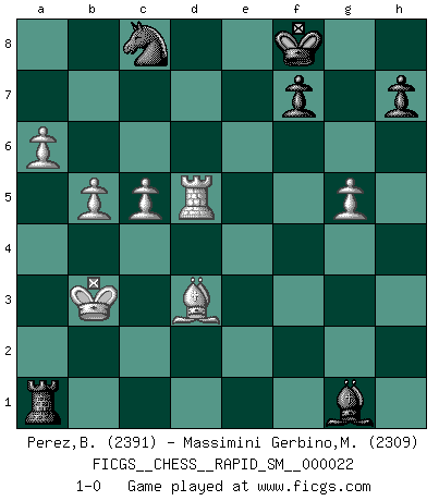 Last move : 1-0 2020 March 3 13:5:2 [Event "FICGS__CHESS__RAPID_SM__000022"] [Site "FICGS"] [Date "2019.11.11"] [Round "1"] [White "Perez,Brigiliano"] [Black "Massimini Gerbino,Massimiliano"] [Result "1-0"] [WhiteElo "2391"] [BlackElo "2309"] 1.e4 c5 2.Nf3 d6 3.d4 cxd4 4.Nxd4 Nf6 5.Nc3 a6 6.Be3 e5 7.Nb3 Be6 8.f3 Be7 9.Qd2 O-O 10.O-O-O Nbd7 11.g4 Qc7 12.Kb1 b5 13.g5 Nh5 14.Nd5 Bxd5 15.exd5 Nb6 16.Na5 Nxd5 17.Qxd5 Qxa5 18.Bd3 Qd8 19.Rhg1 g6 20.Qb7 d5 21.Be4 d4 22.c3 Bc5 23.Qxa8 Qxa8 24.Bxa8 dxe3 25.Rd5 Bb6 26.Bb7 Nf4 27.Rxe5 Nd3 28.Re7 Rd8 29.Bxa6 Bc5 30.Re4 e2 31.Rh1 Nf2 32.Rxe2 Nxh1 33.Bxb5 Nf2 34.b4 Bb6 35.a4 Nh3 36.a5 Bg1 37.Re1 Bf2 38.Re5 Kf8 39.Kb2 Bg1 40.Bf1 Nf4 41.Re4 Ne6 42.h4 Nc7 43.Bc4 Ne8 44.Re2 Rd1 45.Kc2 Ra1 46.f4 Nd6 47.Bd3 Ba7 48.Re5 Bf2 49.a6 Nc8 50.f5 gxf5 51.Kb2 Rd1 52.Bxf5 Nd6 53.Kb3 Ra1 54.Bd3 Bxh4 55.b5 Nc8 56.c4 Bf2 57.c5 Bg1 58.Rd5 1-0 Sicilian : Najdorf, Byrne (English) attack Kingside Castling by player Black (move 9) Queenside Castling by player White (move 10) Player White won this chess game. Follow this game move after move (download)The combination player thinks forward; he starts from the given position, and tries the forceful moves in his mind. (Emanuel Lasker) Ich kenne Menschen, die allen Willen der Welt besitzen und doch nicht Schach spielen können. (Robert James Fischer) El Ajedrez demanda una total concentración. (Bobby Fischer) Karpov est une pièce de musée. (Garry Kasparov) At work, the authority of a person is inversely proportional to the number of pens that person is carrying. (Dan Rotaru)