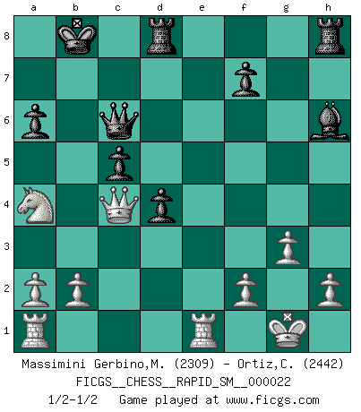 Last move : 1/2-1/2 2020 January 2 11:35:9 [Event "FICGS__CHESS__RAPID_SM__000022"] [Site "FICGS"] [Date "2019.11.11"] [Round "1"] [White "Massimini Gerbino,Massimiliano"] [Black "Ortiz,Clodomiro"] [Result "1/2-1/2"] [WhiteElo "2309"] [BlackElo "2442"] 1.d4 Nf6 2.c4 e6 3.Nf3 d5 4.Nc3 c6 5.Bg5 dxc4 6.e4 b5 7.e5 h6 8.Bh4 g5 9.Nxg5 hxg5 10.Bxg5 Nbd7 11.exf6 Bb7 12.g3 c5 13.d5 Nxf6 14.Bg2 Bh6 15.Bxf6 Qxf6 16.O-O O-O-O 17.Nxb5 a6 18.Nc3 exd5 19.Na4 Bc6 20.Re1 Kb8 21.Qc2 d4 22.Bxc6 Qxc6 23.Qxc4 1/2-1/2 Queen's pawn game Kingside Castling by player White (move 16) Queenside Castling by player Black (move 16) This chess game ended in a draw. Follow this game move after move (download)Checkers is for tramps. (Paul Morphy) Mutter, ich bin eben Ex-Weltmeister geworden. --beim nach Hause Kommen nach dem Verlust des WM-Titels an Mihail Botvinnik -- (Mikhail Nekhemyevich Tal) Es el objetivo de la escuela moderna no tratar cada posición de acuerdo a una regla general, sino de acuerdo al principio inherente en la posición. (Richard Reti) Un footballeur joue avec ses pieds, parfois avec sa tête. Un joueur d'échecs ne joue qu'avec sa tête. Et quand il ne joue plus, il meurt. (Jacob Murray) I don't know, I don't care, and it doesn't make any difference. (Albert Einstein)