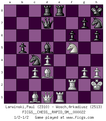 Last move : 1/2-1/2 2020 February 19 16:24:39 [Event "FICGS__CHESS__RAPID_SM__000022"] [Site "FICGS"] [Date "2019.11.11"] [Round "1"] [White "Larwinski,Paul"] [Black "Wosch,Arkadiusz"] [Result "1/2-1/2"] [WhiteElo "2310"] [BlackElo "2513"] 1.c4 Nf6 2.Nc3 e5 3.Nf3 Nc6 4.e4 Bb4 5.d3 d6 6.a3 Bxc3+ 7.bxc3 O-O 8.g3 h6 9.Bg2 Be6 10.O-O Na5 11.Nh4 Re8 12.h3 Rb8 13.Rb1 a6 14.a4 b6 15.f4 exf4 16.Bxf4 Nh7 17.Be3 Nc6 18.Rb2 Ne5 19.Bc1 Kh8 20.Rbf2 f6 21.Re1 Qd7 22.Kh2 Rbd8 23.Nf5 Ng6 24.Bf1 Ne5 25.Be2 c6 26.Ref1 d5 27.cxd5 cxd5 28.d4 Nc4 29.exd5 Bxd5 30.Bd3 b5 31.axb5 axb5 32.Re1 1/2-1/2 English Opening Kingside Castling by player Black (move 7) Kingside Castling by player White (move 10) This chess game ended in a draw. Follow this game move after move (download)Chess is as much a mystery as women. (Purdy) Modernes Schach erfordert enorme Anspannung. Es ist für einen normalen Menschen unmöglich das auszuhalten. (Viktor Kortschnoi) El Ajedrez es una hermosa aventura. (Bent Larsen) Je crois qu'il existe des manières très spécifiques de jouer efficacement contre une machine. Evidemment, nous n'avons aucune chance en technique pure, parce que l'ordinateur calcule de manière parfaite. Mais lorsque nous faisons appel à notre cerveau, en utilisant l'intuition et la compréhension, alors nous restons beaucoup plus forts. (Anatoli Karpov) Think like a man of action, act like a man of thought. (Henri Louis Bergson)