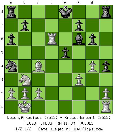 Last move : 1/2-1/2 2020 February 22 23:15:58 [Event "FICGS__CHESS__RAPID_SM__000022"] [Site "FICGS"] [Date "2019.11.11"] [Round "1"] [White "Wosch,Arkadiusz"] [Black "Kruse,Herbert"] [Result "1/2-1/2"] [WhiteElo "2513"] [BlackElo "2635"] 1.e4 c5 2.Nf3 d6 3.d4 cxd4 4.Nxd4 Nf6 5.Nc3 a6 6.Be3 Ng4 7.Bc1 Nf6 8.Be3 e5 9.Nb3 Be6 10.f3 h5 11.Nd5 Bxd5 12.exd5 Nbd7 13.Qd2 g6 14.O-O-O Nb6 15.Kb1 Nbxd5 16.Bg5 Be7 17.g3 Nb6 18.Bxf6 Bxf6 19.Qxd6 h4 20.g4 Na4 21.Bc4 Qxd6 22.Rxd6 1/2-1/2 Sicilian : Najdorf, Byrne (English) attack Queenside Castling by player White (move 14) This chess game ended in a draw. Follow this game move after move (download)There are two classes of men; those who are content to yield to circumstances and who play whist; those who aim to control circumstances, and who play Chess. (Mortimer Collins) Du musst nicht gut spielen, es reicht, wenn du besser spielst als dein Gegner. (Anonymous) Entre mas años cumplo, mas valoro los Peones. (Keres) Soyez une menace à chaque fois que vous vous asseyez pour jouer. (Ken Smith) Life is like a ten-speed bicycle: most of us have gears we never use. (Charles M. Schulz)