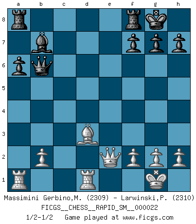 Last move : 1/2-1/2 2019 November 28 1:9:19 [Event "FICGS__CHESS__RAPID_SM__000022"] [Site "FICGS"] [Date "2019.11.11"] [Round "1"] [White "Massimini Gerbino,Massimiliano"] [Black "Larwinski,Paul"] [Result "1/2-1/2"] [WhiteElo "2309"] [BlackElo "2310"] 1.d4 Nf6 2.c4 e6 3.Nf3 d5 4.Nc3 Be7 5.Bf4 O-O 6.e3 Nbd7 7.Qc2 c5 8.dxc5 Nxc5 9.Be2 dxc4 10.Bxc4 a6 11.a4 b6 12.O-O Bb7 13.Qe2 Nd5 14.Nxd5 exd5 15.Bd3 Bf6 16.Be5 Bxe5 17.Nxe5 Qf6 18.Nf3 Ne6 19.a5 d4 20.Nxd4 Nxd4 21.exd4 Qxd4 22.Rfd1 Qf6 23.axb6 Qxb6 1/2-1/2 Queen's pawn game Kingside Castling by player Black (move 5) Kingside Castling by player White (move 12) This chess game ended in a draw. Follow this game move after move (download)Though most people love to look at the games of the great attacking masters, some of the most successful players in history have been the quiet positional players. They slowly grind you down by taking away your space, tying up your pieces, and leaving you with virtually nothing to do ! (Yasser Seirawan) Frage des Reporters: -Welche besonderen Umstände rechtfertigen das Anhalten der Uhren während einer Turnierpartie? Antwort: -Einen Fotographen zu strangulieren. (Siegbert Tarrasch) La esencia del Ajedrez es pensar acerca de lo que el Ajedrez es. (David Bronstein) Les échecs sont un jeu terrible. Si vous n'avez pas le centre, votre adversaire a une position plus libre. Par contre, si vous avez le centre, alors vous avez vraiment quelque chose pour laquelle vous inquiéter ! (Siegbert Tarrasch) He who fights with monsters should be careful lest he thereby become a monster. (Friedrich Nietzsche, Beyond Good and Evil)