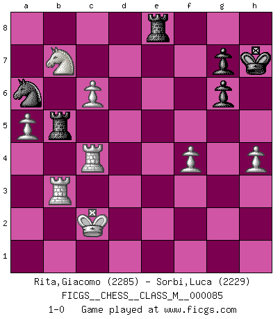 Last move : 1-0 2020 December 31 20:24:51 [Event "FICGS__CHESS__CLASS_M__000085"] [Site "FICGS"] [Date "2019.11.11"] [Round "1"] [White "Rita,Giacomo"] [Black "Sorbi,Luca"] [Result "1-0"] [WhiteElo "2285"] [BlackElo "2229"] 1.e4 e5 2.Nf3 Nf6 3.Nxe5 d6 4.Nf3 Nxe4 5.d4 d5 6.Bd3 Nc6 7.O-O Be7 8.Nbd2 Nxd2 9.Bxd2 Bg4 10.c3 O-O 11.h3 Bh5 12.g3 Qd7 13.Kg2 Bg6 14.Bxg6 fxg6 15.Qc2 Rae8 16.Rae1 Bf6 17.Bf4 Nd8 18.Be5 Nf7 19.Re2 Re7 20.Rfe1 Bxe5 21.dxe5 Nd8 22.Rd2 Ne6 23.Qd3 Ref7 24.Re3 c6 25.h4 Rd8 26.b4 b6 27.Qa6 Qe7 28.Qa4 c5 29.bxc5 bxc5 30.Red3 Qb7 31.Qb3 Qxb3 32.axb3 Rb7 33.c4 d4 34.Ra2 Re7 35.Ra6 Rf8 36.Rd2 Rb8 37.Rb2 Rb6 38.Ra3 Nd8 39.Ra5 Rc7 40.Ne1 a6 41.Kf3 Nb7 42.Ra3 h6 43.Ke4 a5 44.Nd3 Re7 45.Rb1 Kh7 46.f4 Re8 47.g4 h5 48.Rg1 hxg4 49.Rxg4 a4 50.bxa4 Nd6+ 51.Kd5 Nf5 52.Rg1 Ne3+ 53.Kxc5 Rb7 54.Rc1 Rd7 55.Rb3 Ra8 56.e6 Rc8+ 57.Kb4 Re7 58.a5 Rxe6 59.c5 Nd5+ 60.Kc4 Ne3+ 61.Kb5 Nd5 62.Ra3 Rb8+ 63.Kc4 Ne3+ 64.Kxd4 Rd8+ 65.Kc3 Nd5+ 66.Kb2 Re2+ 67.Rc2 Re4 68.Ka2 Rd4 69.Rb2 Nc7 70.R2b3 Na6 71.c6 Rc4 72.Rc3 Re4 73.Nc5 Re2+ 74.Kb3 Rb8+ 75.Nb7 Rd2 76.Ra4 Rd5 77.Kc2 Re8 78.Rd3 Rh5 79.Rc4 Rb5 80.Rb3 1-0 Follow this game move after move (download)Chess is 99 percent tactics. (Teichmann) Obwohl ich alt bin, darf mir niemand den Finger in den Mund stecken, sonst beisse ich. (Wilhelm Steinitz) Aquel que toma al Peón de Caballo de la Reina, se pasará la noche a dormir en la calle. (Anónimo) Tous ces prétendus hommes politiques sont les pions, les Cavaliers, les Tours ou les Fous d'une partie d'échecs qui se jouera tant qu'un hasard ne renversera pas l'échiquier. (Honoré de Balzac) Any activity becomes creative when the doer cares about doing it right or doing it better. (John Updike)