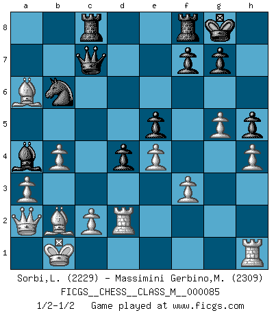 Last move : 1/2-1/2 2020 April 22 12:5:23 [Event "FICGS__CHESS__CLASS_M__000085"] [Site "FICGS"] [Date "2019.11.11"] [Round "1"] [White "Sorbi,Luca"] [Black "Massimini Gerbino,Massimiliano"] [Result "1/2-1/2"] [WhiteElo "2229"] [BlackElo "2309"] 1.e4 c5 2.Nf3 d6 3.d4 cxd4 4.Nxd4 Nf6 5.Nc3 a6 6.Be3 e6 7.f3 b5 8.Qd2 Nbd7 9.g4 h6 10.O-O-O Bb7 11.h4 b4 12.Na4 Qa5 13.b3 Nc5 14.a3 Rc8 15.Qxb4 Qc7 16.Kb1 d5 17.Nxc5 Bxc5 18.Qa4+ Nd7 19.b4 Bxd4 20.Bxd4 O-O 21.g5 h5 22.Bd3 e5 23.Bb2 Bc6 24.Qb3 Nb6 25.Rd2 Ba4 26.Qa2 d4 27.Bxa6 1/2-1/2 Sicilian : Najdorf, Byrne (English) attack Queenside Castling by player White (move 10) Kingside Castling by player Black (move 20) This chess game ended in a draw. Follow this game move after move (download)When I have White, I win because I am white; When I have Black, I win because I am Bogolyubov. (Bogolyubov) Die Fehler sind da, Sie warten nur darauf gemacht zu werden. (Savielly Grigorievitsch Tartakower) El jugador táctico debe saber que hacer cuando algo se debe de hacer. El estratégico debe saber que hacer cuando nada se debe de hacer. (Savielly Tartakover) Les Echecs sont affaire de jugement sensible. Savoir quand frapper et quand esquiver. (Fischer) My poor ole parrot... Is not in the circulation of displays ....poo hoo hoo :) (Wayne Lowrance's enigma)