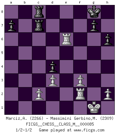 Last move : 1/2-1/2 2019 November 30 17:54:58 [Event "FICGS__CHESS__CLASS_M__000085"] [Site "FICGS"] [Date "2019.11.11"] [Round "1"] [White "Marciz,Alexander"] [Black "Massimini Gerbino,Massimiliano"] [Result "1/2-1/2"] [WhiteElo "2266"] [BlackElo "2309"] 1.e4 c5 2.Nf3 Nc6 3.Nc3 e5 4.Bc4 Be7 5.d3 d6 6.O-O Nf6 7.Ng5 O-O 8.f4 Bg4 9.Qe1 exf4 10.Bxf4 Nd4 11.Qd2 Qd7 12.Rae1 Rae8 13.Be3 h6 14.Nf3 Bxf3 15.gxf3 b5 16.Bxd4 cxd4 17.Nxb5 d5 18.exd5 Nxd5 19.Bxd5 Qxb5 20.Re5 Qxb2 21.Qe2 Rd8 22.Bxf7+ Rxf7 23.Rxe7 Qxa2 24.Qe6 Qxe6 25.Rxe6 Rc7 26.Rf2 Rdc8 1/2-1/2 Sicilian defense Kingside Castling by player White (move 6) Kingside Castling by player Black (move 7) This chess game ended in a draw. Follow this game move after move (download)In Fischer's hands, a slight theoretical advantage is as good a being a Queen ahead. (Isaac Kashdan) Über die Verhaftung Bobby Fischers: Warum es die Bush-Administration für nötig befindet einen 61 Jahre alten Mann zu hetzten, der für niemanden ausser sich selbste eine Gefahr darstellt ist ein Rätsel. (Nigel Short) No hay precio que no valga la pena por la cabellera del Rey enemigo. (Koblentz) Un millionnaire : 'Monsieur Steinitz ! Vous ne participez aux tournois que pour l'argent, alors que moi je n'y viens que pour l'honneur.' Steinitz : 'Chacun joue pour ce qu'il n'a pas'... However beautiful the strategy, you should occasionally look at the results. (Winston Churchill)