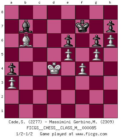 Last move : 1/2-1/2 2020 January 24 0:35:31 [Event "FICGS__CHESS__CLASS_M__000085"] [Site "FICGS"] [Date "2019.11.11"] [Round "1"] [White "Cade,Stephen"] [Black "Massimini Gerbino,Massimiliano"] [Result "1/2-1/2"] [WhiteElo "2277"] [BlackElo "2309"] 1.d4 d5 2.c4 c6 3.Nf3 Nf6 4.e3 e6 5.Bd3 Nbd7 6.b3 Bb4+ 7.Nbd2 Bc3 8.Rb1 e5 9.dxe5 Nxe5 10.Nxe5 Bxe5 11.O-O O-O 12.Qc2 Re8 13.Nf3 Bd6 14.Bb2 Ne4 15.cxd5 cxd5 16.Qd1 Re6 17.Rc1 b6 18.g3 Bc5 19.Nd2 Bb7 20.Nxe4 dxe4 21.Bc4 Qxd1 22.Rfxd1 Rd6 23.Be5 R6d8 24.Bc7 Rxd1+ 25.Rxd1 Bc6 26.g4 Kf8 27.g5 Rc8 28.Bf4 Ke7 29.h4 Bd7 30.Ba6 Re8 31.Bb7 Bg4 32.Rc1 Bf3 33.Rc4 Kf8 34.b4 Be2 35.Rc2 Bd3 36.bxc5 Bxc2 37.Bd6+ Kg8 38.c6 Ba4 39.c7 Bd7 40.h5 Bc8 41.Bd5 g6 42.h6 Re6 43.Bxe6 fxe6 44.Kg2 Kf7 45.Kg3 Ke8 46.Kf4 Kd7 47.Ke5 Bb7 48.a3 Bc8 49.Bf8 Kxc7 50.Kxe4 Kd8 51.Ke5 Ke8 52.Bd6 Kd7 53.f4 a5 54.e4 Ke8 55.Bc7 Kf7 56.Bxb6 a4 57.Kd4 Bb7 58.e5 1/2-1/2 QGD Slav : 4.e3 Kingside Castling by player White (move 11) Kingside Castling by player Black (move 11) This chess game ended in a draw. Follow this game move after move (download)Chess teaches you to control the initial excitement you feel when you see something that looks good and it trains you to think objectively when you're in trouble. (Stanley Kubrick) Wie, soll nun auch die Opposition abgeschafft werden? Ja, es tut mir leid, Ihnen diesen Schmerz nicht ersparen zu können. (Aaron Nimzowitsch) Cuando tu casa esta en llamas, no puedes ser molestado por tus vecinos. O, como decinos en Ajedrez, si tu Rey esta bajo ataque, no te preocupa perder un Peón del lado de la Reina. (Gary Kasparov) J'ai vu le vaincu d'Echecs jouer des années durant dans l'espoir de la fête de la victoire. Car tu es plus riche de ce qu'elle existe si même elle n'est point pour toi. Ainsi de la perle du fond des mers. (Antoine de Saint-Exupéry) If only faces could talk... (Pat Summerall, Sportscaster during the Super Bowl)