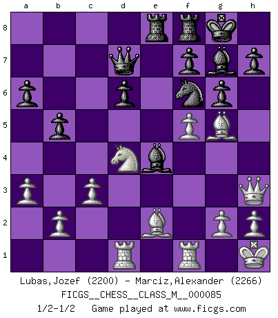 Last move : 1/2-1/2 2019 November 29 19:52:0 [Event "FICGS__CHESS__CLASS_M__000085"] [Site "FICGS"] [Date "2019.11.11"] [Round "1"] [White "Lubas,Jozef"] [Black "Marciz,Alexander"] [Result "1/2-1/2"] [WhiteElo "2200"] [BlackElo "2266"] 1.e4 c5 2.Nf3 Nc6 3.d4 cxd4 4.Nxd4 e6 5.Nc3 Qc7 6.Be3 a6 7.Be2 Nf6 8.O-O Be7 9.f4 d6 10.Qe1 O-O 11.Qg3 Nxd4 12.Bxd4 b5 13.a3 Bb7 14.Kh1 Bc6 15.Rae1 Rad8 16.Bd3 Qd7 17.Bb6 Nh5 18.Qh3 Rb8 19.Be3 g6 20.Ne2 Bf6 21.Nd4 Bb7 22.c3 Rbe8 23.Rd1 Bg7 24.f5 Nf6 25.Bg5 exf5 26.exf5 Be4 27.Be2 Bd5 28.Bd3 Ne4 29.Bh6 Nf6 30.Bg5 Be4 31.Be2 1/2-1/2 Sicilian defense Kingside Castling by player White (move 8) Kingside Castling by player Black (move 10) This chess game ended in a draw. Follow this game move after move (download)Chess is war over the board. The object is to crush the opponents mind. (Bobby Fischer) Pläne sind die Träume des Verständigen. (Ernst Freiherr von Feuchtersleben) Bendita sea la memoria de aquel que dio al mundo este juego inmortal. (A. G. Gardiner) Il vaut mieux sacrifier les pièces de l'adversaire. (Xavier Tartacover) Indecision is the key to flexibility. (Unknown)
