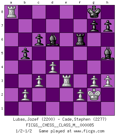 Last move : 1/2-1/2 2019 November 27 11:25:5 [Event "FICGS__CHESS__CLASS_M__000085"] [Site "FICGS"] [Date "2019.11.11"] [Round "1"] [White "Lubas,Jozef"] [Black "Cade,Stephen"] [Result "1/2-1/2"] [WhiteElo "2200"] [BlackElo "2277"] 1.e4 e5 2.Nf3 Nc6 3.Bb5 a6 4.Ba4 Nf6 5.O-O Be7 6.Re1 b5 7.Bb3 O-O 8.c3 d5 9.exd5 Nxd5 10.Nxe5 Nxe5 11.Rxe5 c6 12.d4 Bd6 13.Re1 Qh4 14.g3 Qh3 15.Be3 Bg4 16.Qd3 Rae8 17.Nd2 Qh5 18.a4 Re6 19.axb5 axb5 20.Qf1 Rfe8 21.Bxd5 Qxd5 22.h3 Bh5 23.Qg2 Qxg2+ 24.Kxg2 f5 25.Nf3 f4 26.Ng5 fxe3 27.Nxe6 Rxe6 28.Rxe3 Rf6 29.Ra8+ 1/2-1/2 Ruy Lopez : Closed, 7...O-O Kingside Castling by player White (move 5) Kingside Castling by player Black (move 7) This chess game ended in a draw. Follow this game move after move (download)Of Chess it has been said that life is not long enough for it, but that is the fault of life, not Chess. (William Ewart Napier) Schach ist ein Reich, wo sich die menschliche Phantasie frei entfalten kann. (David Bronstein) Fischer no está bajo la obligación de nadie. (Joseph Platz) Les échecs sont un jeu terrible. Si vous n'avez pas le centre, votre adversaire a une position plus libre. Par contre, si vous avez le centre, alors vous avez vraiment quelque chose pour laquelle vous inquiéter ! (Siegbert Tarrasch) If we don't succeed, we run the risk of failure. (George W. Bush)
