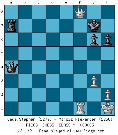 Last move : 1/2-1/2 2019 December 6 20:6:19 [Event "FICGS__CHESS__CLASS_M__000085"] [Site "FICGS"] [Date "2019.11.11"] [Round "1"] [White "Cade,Stephen"] [Black "Marciz,Alexander"] [Result "1/2-1/2"] [WhiteElo "2277"] [BlackElo "2266"] 1.d4 Nf6 2.c4 e6 3.g3 d5 4.Bg2 dxc4 5.Nf3 Be7 6.O-O O-O 7.Qc2 a6 8.a4 Bd7 9.Qxc4 Bc6 10.Bg5 Bd5 11.Qc2 Be4 12.Qc1 h6 13.Bxf6 Bxf6 14.Rd1 Nc6 15.Nbd2 Bg6 16.Nb3 Qd6 17.Nc5 Ra7 18.e3 b6 19.Nd2 bxc5 20.Nc4 Qe7 21.Bxc6 cxd4 22.exd4 Bxd4 23.Rxd4 Qc5 24.Qe3 Qxc6 25.Ne5 Qb7 26.b4 R7a8 27.Nxg6 fxg6 28.Qxe6+ Kh7 29.Qe4 Qa7 30.Rad1 Rae8 31.Qc2 Rf6 32.Rd7 Qb6 33.Rxc7 Rxf2 34.Rxg7+ Kxg7 35.Qxf2 Qxb4 36.Qa7+ Re7 37.Qxa6 Qc5+ 38.Kh1 Qc2 39.Rf1 Qe4+ 40.Kg1 Qd4+ 41.Kh1 Ra7 42.Qc8 Qxa4 43.Qf8+ 1/2-1/2 Catalan : Open, Classical line Kingside Castling by player White (move 6) Kingside Castling by player Black (move 6) 10 pieces endgame at move 42 : White KQRPP , Black KQRPP WHITE : King + 1 Queen 1 Rook 2 Pawns BLACK : King + 1 Queen 1 Rook 2 Pawns This chess game ended in a draw. Follow this game move after move (download)Some sacrifices are sound; the rest are mine. (Mikhail Tal) Ein Kibitz ist einer, der deinem Gegner gute Ratschläge gibt. (Andrew Soltis) Alekhine es un poeta que crea un trabajo de arte de algo que raramente inspiraría a otra persona a mandar una tarjeta postal. (Max Euwe) Si je n'étais pas joueur d'échecs, je serais le meilleur dans quelque chose d'autre. (Anatoli Karpov) Perseverance does not equal worthiness. Next time you want to get my attention, wear something fun. Low-riding jeans are hot. (Gregory House, House M.D.)