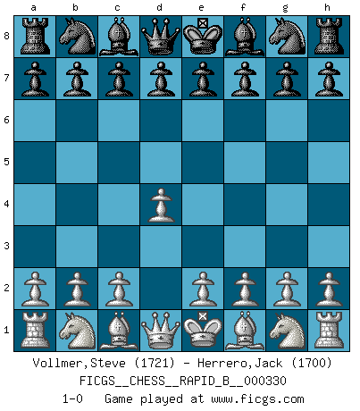 Last move : 1-0 2019 December 16 11:20:1 [Event "FICGS__CHESS__RAPID_B__000330"] [Site "FICGS"] [Date "2019.11.15"] [Round "1"] [White "Vollmer,Steve"] [Black "Herrero,Jack"] [Result "1-0"] [WhiteElo "1721"] [BlackElo "1700"] 1.d4 1-0 This chess game has been lost on time (started : 2019.11.15 18:29:22) Queen's pawn Player White won this chess game. Follow this game move after move (download)Chess is a foolish expedient for making idle people believe they are doing something very clever when they are only wasting their time. (George Bernard Shaw) Wer nie einen Fehler gemacht hat, hat nie etwas Neues ausprobiert. (Albert Einstein) Las Aperturas te enseñan aperturas. ¡Los Finales te enseñan Ajedrez!. (Stephan Gerzadowicz) Le pion, dans sa simplicité, marche droit devant lui, mais lorsqu'il prend, il le fait obliquement? Ainsi l'homme, tant qu'il reste pauvre, marche dans la droiture et vit honnêtement, mais lorsqu'il recherche les honneurs, il flatte, se parjure et, par les voies obliques, cherche une position supérieure sur l'échiquier du monde. (Jean de Galles) When you have everything, sometimes it feels like nothing. (Horatio Caine, C.S.I. Miami)