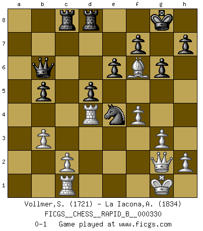 Last move : 0-1 2019 December 20 11:4:36 [Event "FICGS__CHESS__RAPID_B__000330"] [Site "FICGS"] [Date "2019.11.15"] [Round "1"] [White "Vollmer,Steve"] [Black "La Iacona,Alessandro"] [Result "0-1"] [WhiteElo "1721"] [BlackElo "1834"] 1.d4 Nf6 2.Nf3 d5 3.g3 c6 4.Bg2 g6 5.O-O Bg7 6.Nc3 O-O 7.a4 Bf5 8.Nh4 Be6 9.f4 Qc8 10.e3 Bh3 11.Qe2 Bxg2 12.Qxg2 e6 13.Bd2 c5 14.Nf3 cxd4 15.Nxd4 Nc6 16.Rad1 Nxd4 17.exd4 Qc4 18.Bc1 Rac8 19.Rd3 Rfd8 20.b3 Qc6 21.Bb2 a6 22.Rc1 b5 23.axb5 axb5 24.Ba3 Ne4 25.Bb4 Bxd4+ 26.Rxd4 Nxc3 27.Be7 Qb6 28.Bf6 Ne4 0-1 Queen's pawn game Kingside Castling by player White (move 5) Kingside Castling by player Black (move 6) Player Black won this chess game. Follow this game move after move (download)First-class players lose to second-class players because second-class players sometimes play a first-class game. (Siegbert Tarrasch) Schach sollte überall auf der Welt Schulfach werden. Es fördert die geistige Auseinandersetzung. Es lehrt die Demut in der Niederlage. (Garry Kasparov) Cuando estes solo, cuando te sientas un extraño en el mundo, juega al Ajedrez. Esto levantará tu espiritu y será tu consejero de guerra. (Aristóteles) Je ne suis pas le dernier à jouer lâchement des coups douteux pendant le zeïtnot de l'adversaire pour l'achever: en effet les coups qui font le plus peur sont ceux que l'on ne comprend pas. Je me fais souvent peur quand je joue. (Un professeur anonyme) There are lots of people who mistake their imagination for their memory. (Josh Bilings)