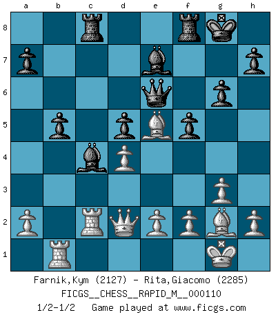 Last move : 1/2-1/2 2019 December 17 10:25:54 [Event "FICGS__CHESS__RAPID_M__000110"] [Site "FICGS"] [Date "2019.11.16"] [Round "1"] [White "Farnik,Kym"] [Black "Rita,Giacomo"] [Result "1/2-1/2"] [WhiteElo "2127"] [BlackElo "2285"] 1.d4 Nf6 2.c4 e6 3.Nf3 b6 4.g3 Ba6 5.b3 Bb4+ 6.Bd2 Be7 7.Bg2 d5 8.O-O Nbd7 9.Ne5 Bb7 10.Bf4 O-O 11.Nc3 Ne4 12.Rc1 Nxe5 13.Bxe5 Rc8 14.cxd5 exd5 15.Bh3 f5 16.Qd3 Qd7 17.b4 Qe6 18.b5 c5 19.bxc6 Bxc6 20.Rc2 Nc5 21.Qd2 Nb7 22.Nd1 Na5 23.Qd3 g6 24.Ne3 Nc4 25.Nxc4 Bb5 26.Bg2 Bxc4 27.Qd2 b5 28.Rb1 1/2-1/2 Queen's Indian : Nimzovich variation (exaggerated Fianchetto) Kingside Castling by player White (move 8) Kingside Castling by player Black (move 10) This chess game ended in a draw. Follow this game move after move (download)Weak points or holes in the opponent's position must be occupied by pieces not Pawns. (Siegbert Tarrasch) Zu meiner Zeit war ein 20 jähriger ein junger Spieler, heute ist er ein Veteran. (Garry Kasparov) Si pudieramos observar el interior de la cabeza de un jugador de Ajedrez, encontraríamos ahí un mundo lleno de sentimientos, imágenes, ideas, emoción y pasión. (Alfred Binet) Ne tendez aucun piège pour le plaisir ! Ne jouez rien dans l'espoir que l'adversaire réagisse de façon stupide ! Prenez toujours pour acquis que l'adversaire va trouver le meilleur coup ! Ne jouez jamais de coup dans l'espoir que l'adversaire ne voie pas la menace ! Chacun de vos coups doit améliorer la position d'une façon ou d'une autre. A proverb is a short sentence based on long experience. (Miguel de Cervantes)