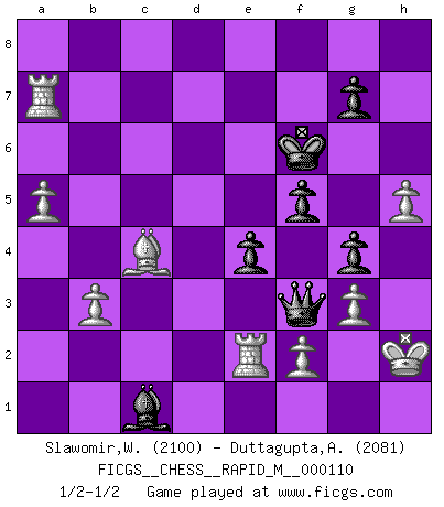 Last move : 1/2-1/2 2020 January 25 14:2:23 [Event "FICGS__CHESS__RAPID_M__000110"] [Site "FICGS"] [Date "2019.11.16"] [Round "1"] [White "Slawomir,Weglicki"] [Black "Duttagupta,Aniruddha"] [Result "1/2-1/2"] [WhiteElo "2100"] [BlackElo "2081"] 1.e4 Nf6 2.e5 Nd5 3.d4 d6 4.Nf3 dxe5 5.Nxe5 c6 6.Be2 Bf5 7.O-O Nd7 8.Nf3 e6 9.c4 N5f6 10.Nc3 Bd6 11.Nh4 Bg6 12.g3 O-O 13.Nxg6 hxg6 14.Bg5 e5 15.d5 cxd5 16.Nxd5 Be7 17.Bg4 Nxd5 18.Qxd5 Bxg5 19.Bxd7 Qc7 20.Rfe1 Rfd8 21.Rad1 Bf6 22.b3 a5 23.Re3 Kf8 24.a3 Ra6 25.c5 Re6 26.Bxe6 Rxd5 27.Bxd5 Qxc5 28.Bxb7 Bg5 29.R3e1 Qc7 30.Bd5 f5 31.h4 Bh6 32.Re2 e4 33.a4 g5 34.h5 Qc3 35.Bc4 g4 36.Rd5 Qf3 37.Kh2 Ke7 38.Rxa5 Bc1 39.Ra7+ Kf6 40.a5 1/2-1/2 Alekhine's defense : Modern, Larsen variation Kingside Castling by player White (move 7) Kingside Castling by player Black (move 12) This chess game ended in a draw. Follow this game move after move (download)Modern Chess is too much concerned with things like Pawn structure. Forget it, Checkmate ends the game. (Nigel Short) Woher wissen wir, daß der Neanderthaler Blindschach gespielt hat? -- Bei Ausgrabungen wurden keine Schachbretter und Figuren gefunden. (Anonymous) Aquellos que dicen que entienden al Ajedrez, no entienden nada. (Robert Hubner) Les Echecs, c'est l'art de la guerre sans les charniers, c'est la résurrection des morts tombés au champ d'honneur, l'espoir perpétuel, la suprématie de l'intelligence sur la force, la culture de l'esprit. (F. Szpiner) Perception is reality. (Immanuel Kant)