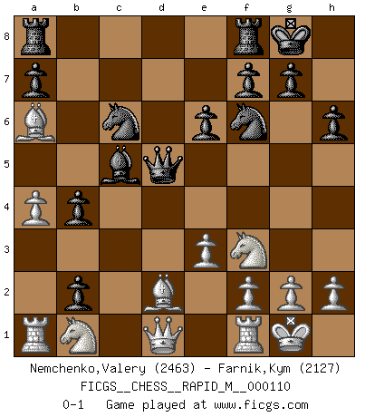 Last move : 0-1 2019 November 27 14:54:46 [Event "FICGS__CHESS__RAPID_M__000110"] [Site "FICGS"] [Date "2019.11.16"] [Round "1"] [White "Nemchenko,Valery"] [Black "Farnik,Kym"] [Result "0-1"] [WhiteElo "2463"] [BlackElo "2127"] 1.d4 Nf6 2.Nf3 d5 3.c4 e6 4.Nc3 c6 5.Bg5 h6 6.Bd2 dxc4 7.e3 b5 8.a4 b4 9.Nb1 Ba6 10.Be2 c5 11.dxc5 Bxc5 12.Ne5 Qd5 13.Nf3 O-O 14.O-O Nc6 15.b3 cxb3 16.Bxa6 b2 0-1 Queen's pawn game Kingside Castling by player Black (move 13) Kingside Castling by player White (move 14) Player Black won this chess game. Follow this game move after move (download)Chess is a fairy tale of 1001 blunders. (Savielly Tartakower) Schach ist Leben. (Robert James Fischer) La única cosa que los jugadores de Ajedrez tienen en común, es el Ajedrez. (Lodewijk Prins) Les Echecs mettent en conflit, non pas deux intelligences, mais deux volontés. (Lasker) Optimism is a variety of information deficit. Sometimes especially true for correspondence chess games. (Michael Aigner)