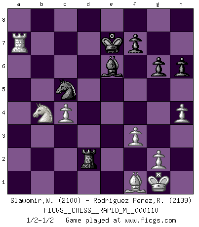 Last move : 1/2-1/2 2020 February 5 19:12:3 [Event "FICGS__CHESS__RAPID_M__000110"] [Site "FICGS"] [Date "2019.11.16"] [Round "1"] [White "Slawomir,Weglicki"] [Black "Rodriguez Perez,Rene"] [Result "1/2-1/2"] [WhiteElo "2100"] [BlackElo "2139"] 1.d4 e6 2.c4 d5 3.Nc3 Nf6 4.cxd5 exd5 5.Bg5 Nbd7 6.e3 h6 7.Bf4 Bb4 8.Bd3 O-O 9.Nge2 Nh5 10.Qb3 a5 11.a3 Nxf4 12.Nxf4 Bxc3+ 13.bxc3 Nb6 14.O-O Qd6 15.Rab1 Bd7 16.Rfc1 Rab8 17.h3 Rfc8 18.Qa2 Ra8 19.a4 Rab8 20.Bb5 Bf5 21.Rb2 Rd8 22.Bf1 Bd7 23.R2b1 Nxa4 24.c4 c5 25.dxc5 Nxc5 26.Qxa5 b6 27.Qa1 Bf5 28.Rb4 d4 29.Qxd4 Qxd4 30.exd4 Rxd4 31.Nd5 Rb7 32.Nxb6 g6 33.f3 Rd2 34.Nd5 Rxb4 35.Nxb4 Kf8 36.h4 Ke7 37.Ra1 Be6 38.Ra7+ 1/2-1/2 Queen's pawn Kingside Castling by player Black (move 8) Kingside Castling by player White (move 14) This chess game ended in a draw. Follow this game move after move (download)Though most people love to look at the games of the great attacking masters, some of the most successful players in history have been the quiet positional players. They slowly grind you down by taking away your space, tying up your pieces, and leaving you with virtually nothing to do ! (Yasser Seirawan) Nicht daß Diemer aus Opportunismus Mitglied der NSDAP geworden wäre. Er war ein Fanatiker, in allem, was er tat. (Hans Ree) La mitad de las variaciones que son calculadas en una partida de torneo, resultan ser completamente superfluas. Desafortunadamente, nadie sabe por adelantado cual mitad. (Jan Tinman) Même si vous avez un bon coup à faire, regardez toujours s'il n'y en a pas un qui lui soit préférable. (Pedro Damiano) For peace of mind, resign as general manager of the universe. (Douglas Adams)