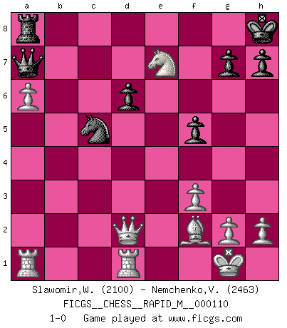 Last move : 1-0 2019 November 28 19:33:11 [Event "FICGS__CHESS__RAPID_M__000110"] [Site "FICGS"] [Date "2019.11.16"] [Round "1"] [White "Slawomir,Weglicki"] [Black "Nemchenko,Valery"] [Result "1-0"] [WhiteElo "2100"] [BlackElo "2463"] 1.e4 c5 2.Nf3 Nc6 3.d4 cxd4 4.Nxd4 d6 5.c4 Nf6 6.Nc3 Bg4 7.f3 Bd7 8.Be3 Nxd4 9.Bxd4 e6 10.Qd2 Be7 11.Be2 O-O 12.O-O Bc6 13.Rfd1 Qc7 14.a4 a6 15.a5 b6 16.Bxb6 Qb7 17.b4 Nd7 18.Bf2 f5 19.b5 axb5 20.cxb5 Nc5 21.a6 Qc7 22.bxc6 Qxc6 23.exf5 exf5 24.Bc4+ Kh8 25.Bd5 Qc7 26.Bxa8 Rxa8 27.Nd5 Qa7 28.Nxe7 1-0 Sicilian defense Kingside Castling by player Black (move 11) Kingside Castling by player White (move 12) Player White won this chess game. Follow this game move after move (download)You are for me the Queen on d8 and I am the Pawn on d7 !! (Eduard Gufeld) Die Partien sind immer verschieden, die Interviews immer die gleichen. (Garry Kasparov) Desconfianza es la característica mas necesaria de un jugador de Ajedrez. (Siegbert Tarrasch) Les ravages du H expliquent la différence de niveau entre Tal et Thal [Abergel]. I take risks, sometimes patients die, but not taking risks causes more patients to die. So I guess my biggest problem is I've been cursed with the ability to do the math. (Gregory House, House M.D.)