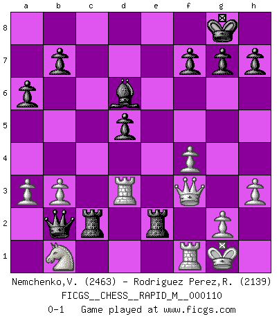 Last move : 0-1 2020 January 18 11:3:58 [Event "FICGS__CHESS__RAPID_M__000110"] [Site "FICGS"] [Date "2019.11.16"] [Round "1"] [White "Nemchenko,Valery"] [Black "Rodriguez Perez,Rene"] [Result "0-1"] [WhiteElo "2463"] [BlackElo "2139"] 1.e4 e6 2.d4 d5 3.Nc3 Nf6 4.exd5 exd5 5.Nf3 Be6 6.Be2 a6 7.O-O Bd6 8.h3 O-O 9.Ne5 Nbd7 10.f4 c5 11.b3 cxd4 12.Nxd7 Nxd7 13.Nb1 Qf6 14.Bg4 Nc5 15.Bb2 Bxg4 16.Qxg4 Rac8 17.Na3 Ne4 18.Rad1 Nc3 19.Bxc3 Rxc3 20.Nb1 Rxc2 21.a3 Re8 22.Rd2 d3 23.Rxd3 Qb2 24.Qf3 R8e2 0-1 French defense Kingside Castling by player White (move 7) Kingside Castling by player Black (move 8) Player Black won this chess game. Follow this game move after move (download)Not all artists are Chess players, but all Chess players are artists. (Marcel Duchamp) Über Frauen: Chess is better. (Robert James Fischer) El muchacho (en ese entonces un niño de 12 años llamado Anatoly Karpov) no tiene ni idea de lo que es el Ajedrez y no hay futuro en absoluto para el en esta profesión. (Mikhail Botvinnik) Avant la finale, les dieux ont créé le milieu de partie. (Tarrasch) You lose, general Kenobi. (General Grievous in Star Wars ep.3)