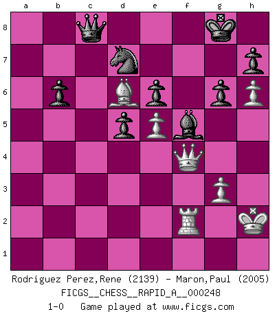 Last move : 1-0 2020 March 6 14:37:34 [Event "FICGS__CHESS__RAPID_A__000248"] [Site "FICGS"] [Date "2019.11.16"] [Round "1"] [White "Rodriguez Perez,Rene"] [Black "Maron,Paul"] [Result "1-0"] [WhiteElo "2139"] [BlackElo "2005"] 1.e4 e6 2.d4 d5 3.Bd3 Nf6 4.e5 Nfd7 5.Nc3 c5 6.f4 Nc6 7.Nf3 Nxd4 8.Nxd4 cxd4 9.Ne2 Bc5 10.O-O O-O 11.Qe1 f6 12.b4 Bb6 13.Qg3 fxe5 14.fxe5 Rxf1+ 15.Kxf1 Qc7 16.Bf4 Nf8 17.h4 Bd7 18.a4 a5 19.bxa5 Rxa5 20.h5 Rxa4 21.Rb1 Bc5 22.h6 g6 23.Bg5 Ra3 24.Bf6 Ba4 25.Rc1 Ra2 26.Nf4 Qf7 27.Kg1 Rxc2 28.Rf1 Rd2 29.Kh2 Rd1 30.Rf3 b6 31.Bg7 Qe8 32.Rf2 Rxd3 33.Nxd3 Nd7 34.Ra2 Bc6 35.Qg4 Qf7 36.Rf2 Qe7 37.g3 Qe8 38.Rf1 Bf8 39.Bxf8 Bb5 40.Bd6 Bxd3 41.Rf2 Bf5 42.Qxd4 Qc8 43.Qf4 1-0 French : Schlechter variation Kingside Castling by player White (move 10) Kingside Castling by player Black (move 10) Player White won this chess game. Follow this game move after move (download)Chess is thirty to forty percent psychology. You don't have this when you play a computer. I can't confuse it. (Judith Polgar) Spielt Blackmar-Diemer-Gambit, und das Matt kommt von selbst! (Emil Joseph Diemer) Observen a Garry Kasparov. Después de una derrota, invariablemente el gana la próxima partida. Prácticamente hace pedazos a su siguiente oponente. Eso es algo que tenemos que aprender a lograr. (Maurice Ashley) Pour moi, les échecs ne sont pas un jeu mais un art. (Alexandre Alekhine) There is far too much law for those who can afford it and far too little for those who cannot. (Derek Bok)