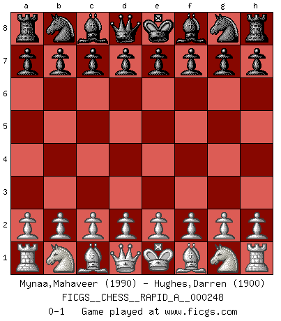 Last move : 0-1 2019 December 16 23:47:9 [Event "FICGS__CHESS__RAPID_A__000248"] [Site "FICGS"] [Date "2019.11.16"] [Round "1"] [White "Mynaa,Mahaveer"] [Black "Hughes,Darren"] [Result "0-1"] [WhiteElo "1990"] [BlackElo "1900"] 0-1 This chess game has been lost on time (started : 2019.11.16 18:31:3) Player Black won this chess game. Follow this game move after move (download)Your body has to be in top condition. Your Chess deteriorates as your body does. You can't separate body from mind. (Bobby Fischer) Wenn du gegen Bobby spielst, ist es keine Frage von gewinnen oder verlieren. Es ist eine Frage des Überlebens. (Boris Vassilievich Spassky) Estaba muy claro de que el punto vulnerable del Gran Maestro Americano (Bobby Fischer) radicaba en las posiciones de doble filo, colgantes, irracionales, donde el siempre falló en encontrar un triunfo aún en una posición de clara victoria. (Efim Geller) On n'a jamais que l'âge auquel on a commence à jouer aux échecs car après on cesse de vieillir. (Capablanca) You can think I'm wrong, but that's no reason to quit thinking. (Gregory House, House M.D.)