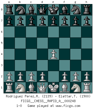 Last move : 1-0 2019 December 17 0:22:23 [Event "FICGS__CHESS__RAPID_A__000248"] [Site "FICGS"] [Date "2019.11.16"] [Round "1"] [White "Rodriguez Perez,Rene"] [Black "Elattar,Tarek"] [Result "1-0"] [WhiteElo "2139"] [BlackElo "1900"] 1.e4 1-0 This chess game has been lost on time (started : 2019.11.16 18:31:3) King's pawn Opening Player White won this chess game. Follow this game move after move (download)You can only get good at Chess if you love the game. (Bobby Fischer) Computer sind die einzigen Gegner, die nicht immer eine Ausrede auf Lager haben, wenn sie gegen mich verlieren. (Robert James Fischer) Yo no le temo a Spassky. Todos saben que yo soy el mejor. Uno no necesita un torneo para probarlo. (Bobby Fischer) Echiquier : carré parfait, comme la Jérusalem nouvelle décrite par l'auteur de l'Apocalypse, huit cases sur huit, exaltation du chiffre 4, symbole du cosmos aux quatre horizons... où le noir et le blanc, l'ombre et la lumière, le mal et le bien s'entremêlent et se conjuguent. (Robert Couffignal, Le Gambit du poète) The production of too many useful things results in too many useless people. (Karl Marx)